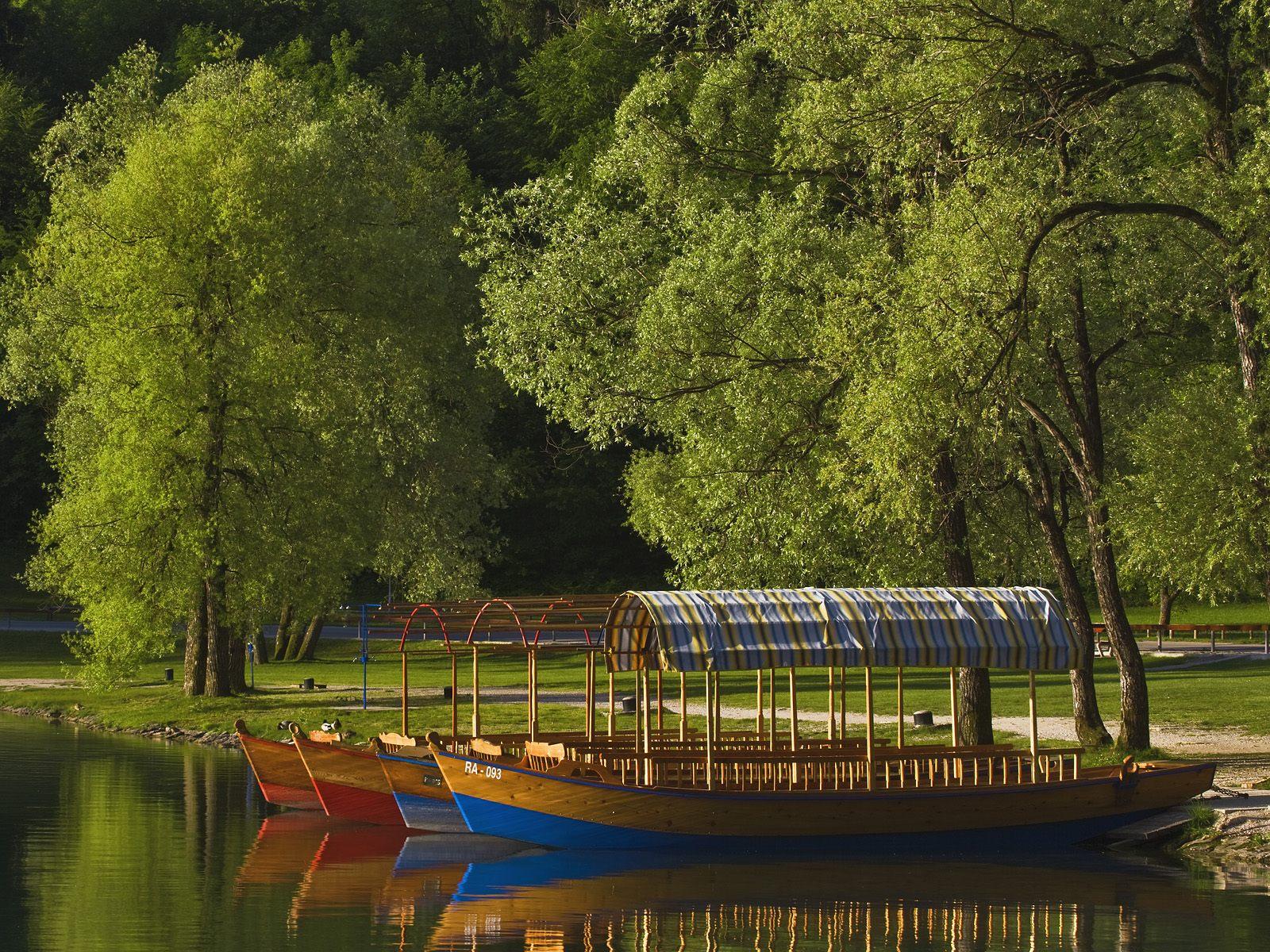 Description: A row of boats sitting on top of a lake next to a forest filled with trees and grass covered shore.