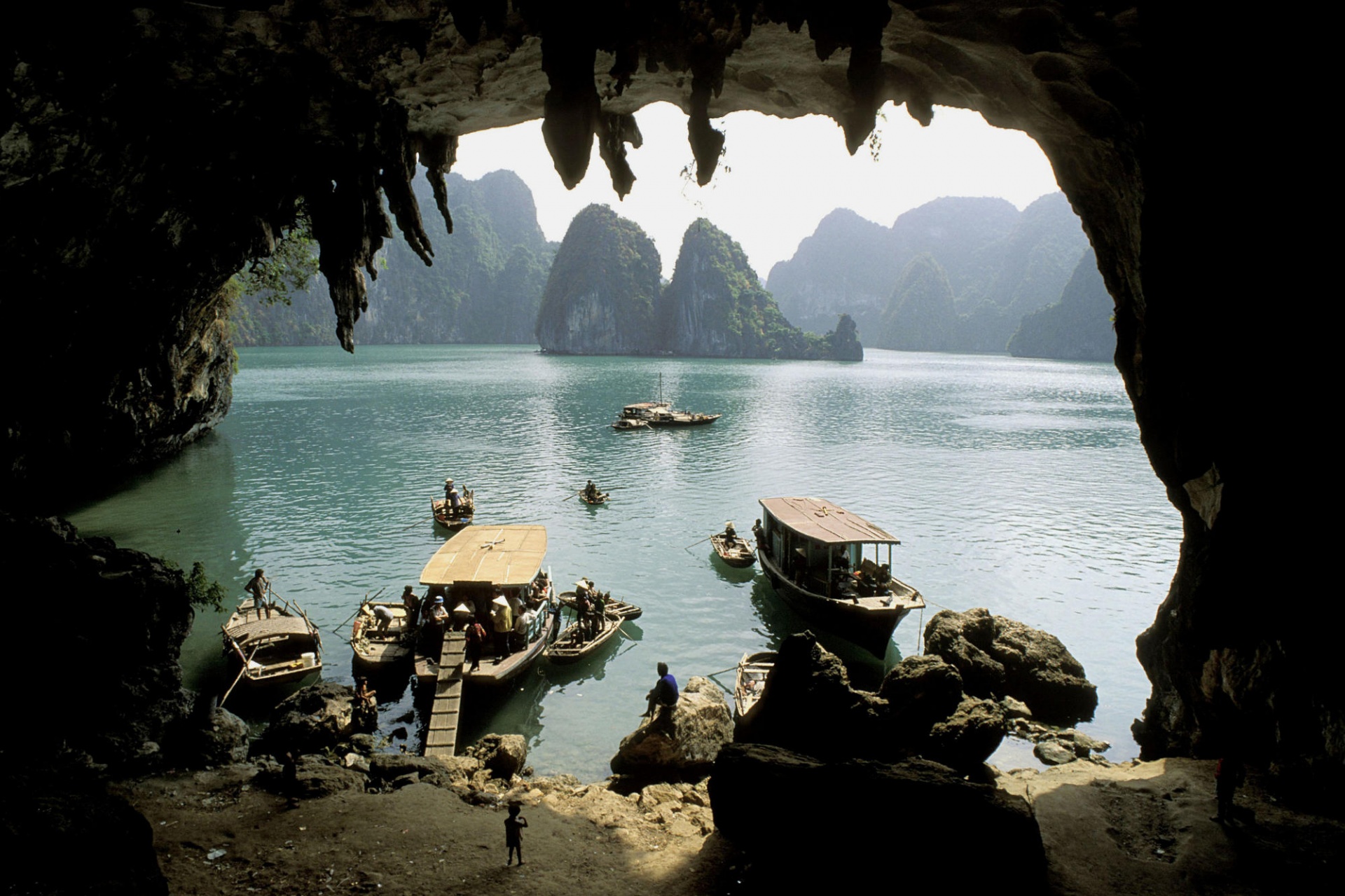 Description: A group of boats floating on top of a lake next to mountains and rocks in the water with people standing on the shore.