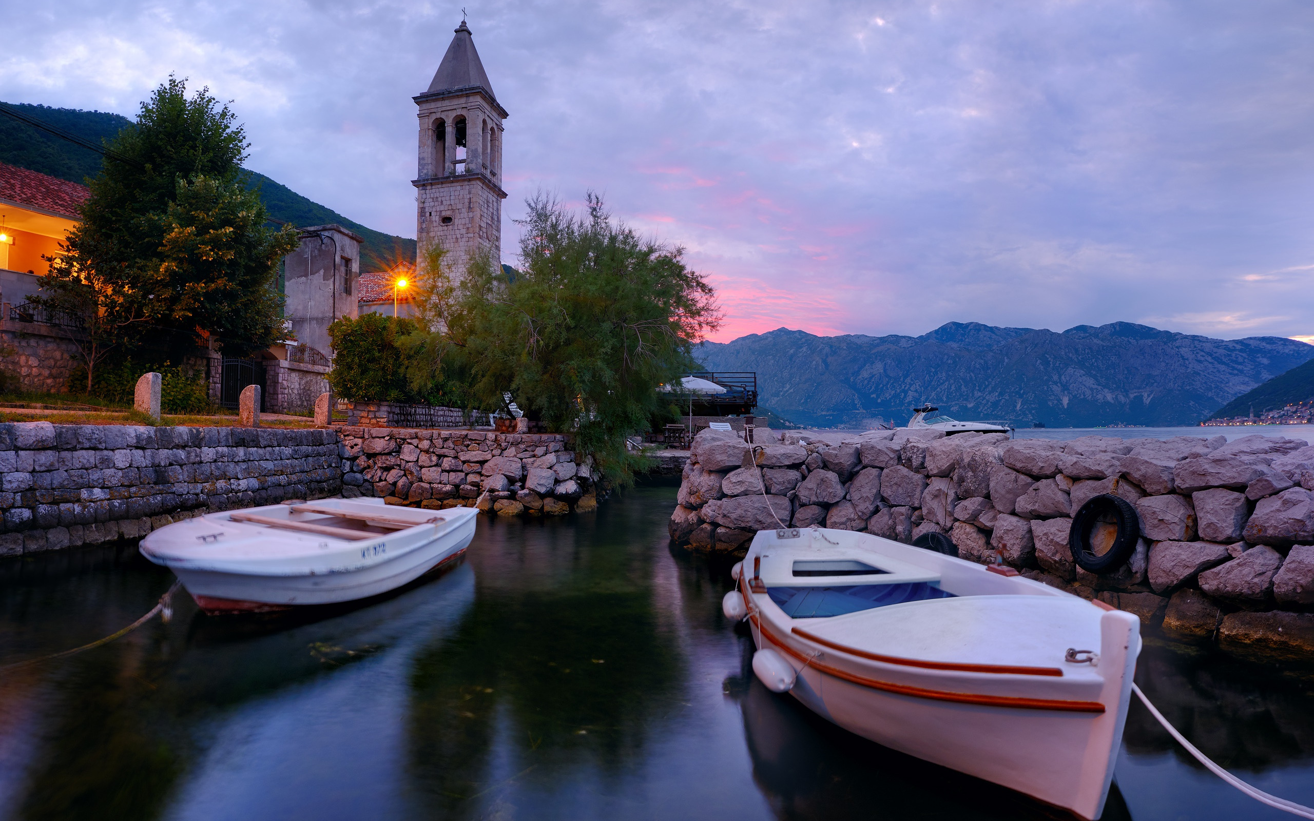 Description: A couple of boats that are sitting in the water near a wall and a clock tower in the background.