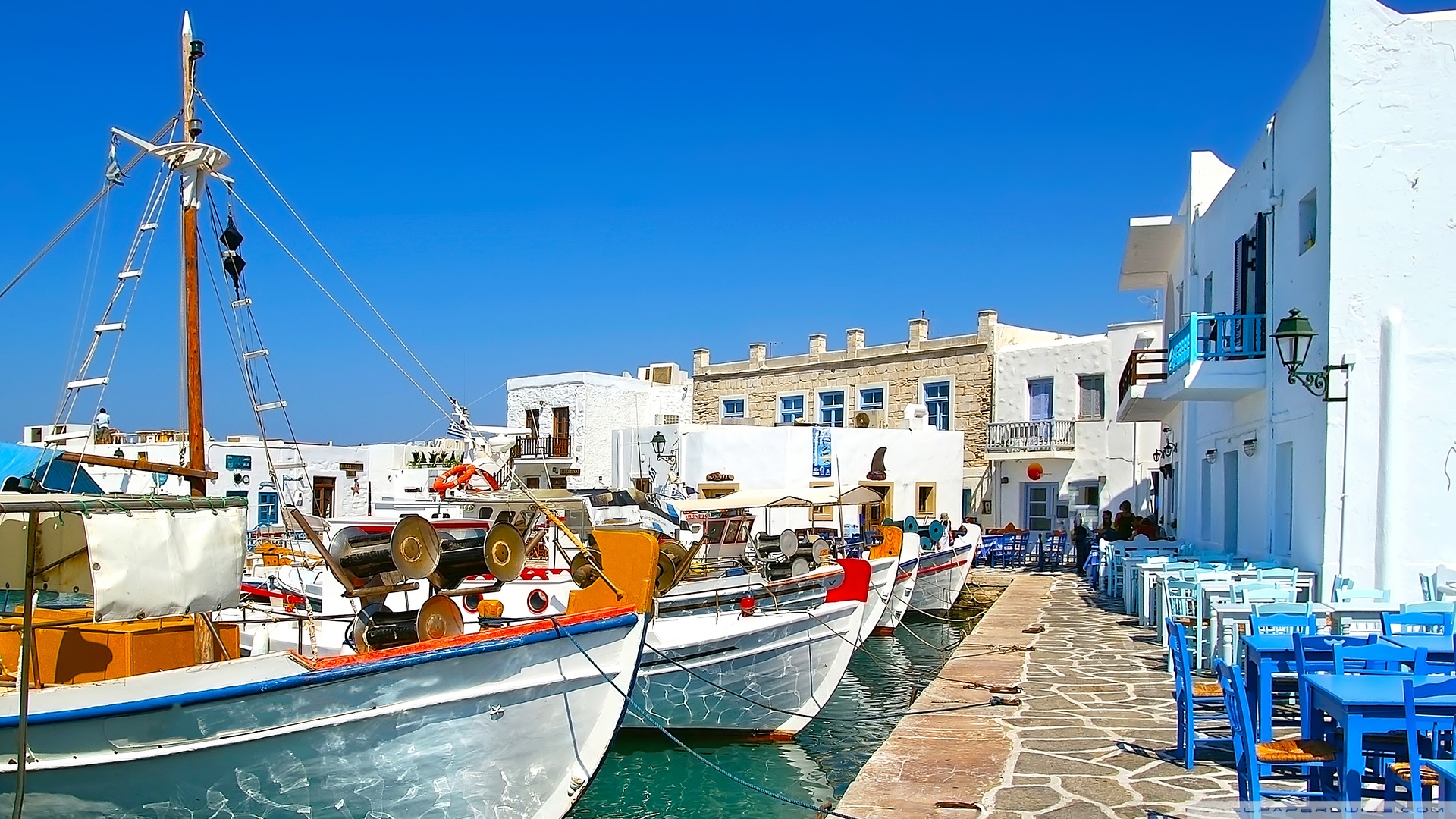 Description: A couple of boats that are sitting in the water near a building and some chairs and tables in front of them.