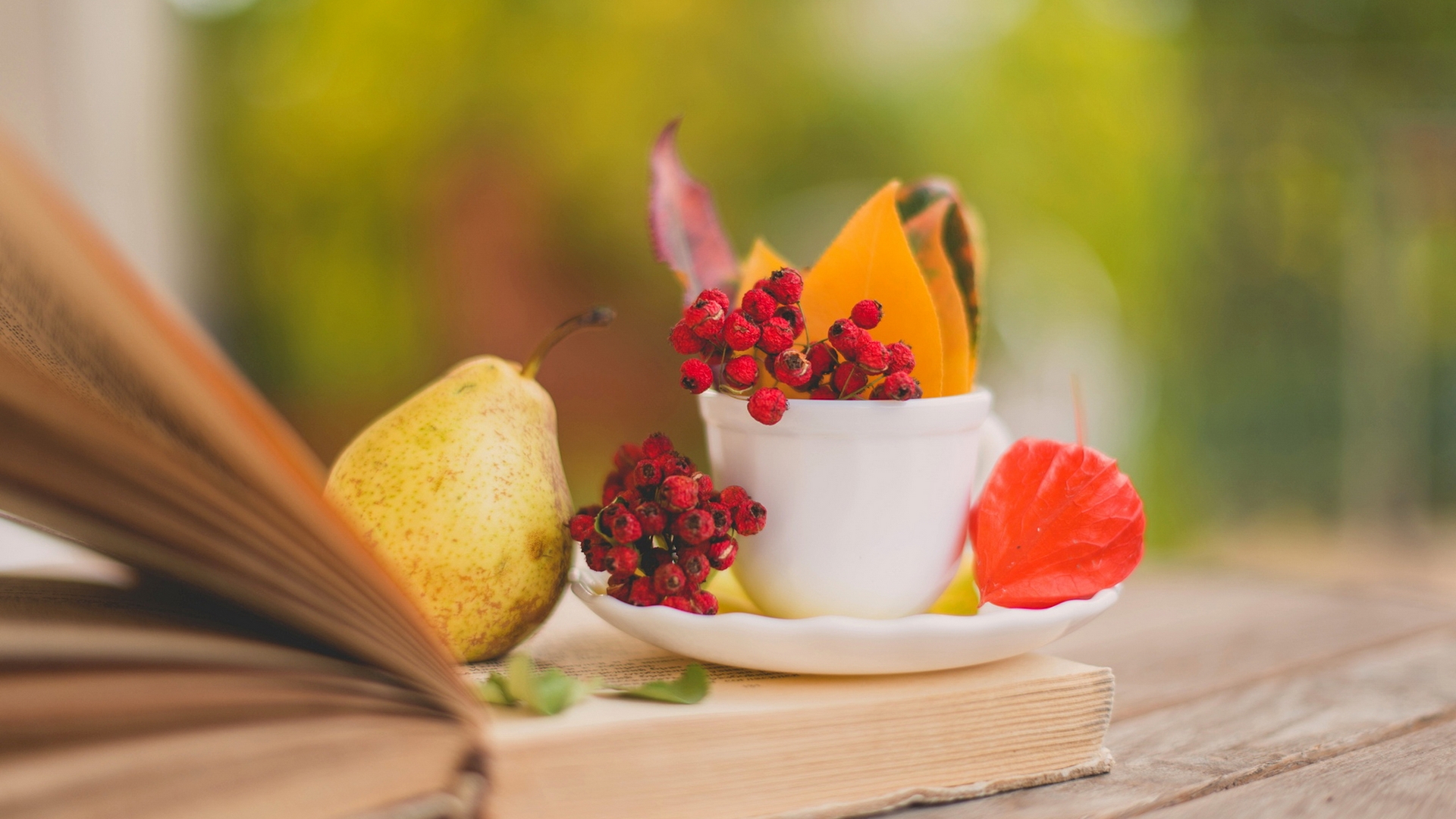 Description: A book with a bowl of fruit and a cup of coffee on it sitting on a table next to a book.