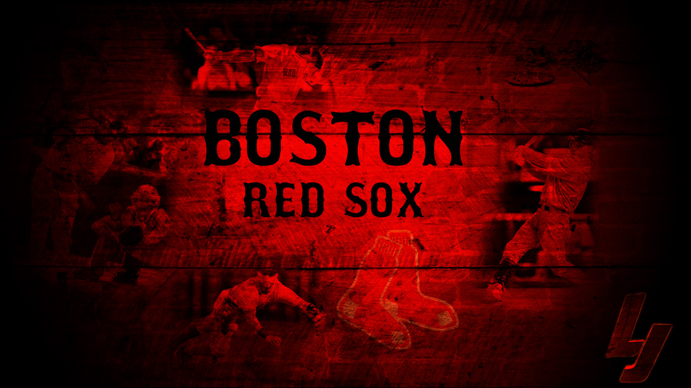 Description: A red sign that says boston red sox on it's side of a wall with pictures of people and dogs.