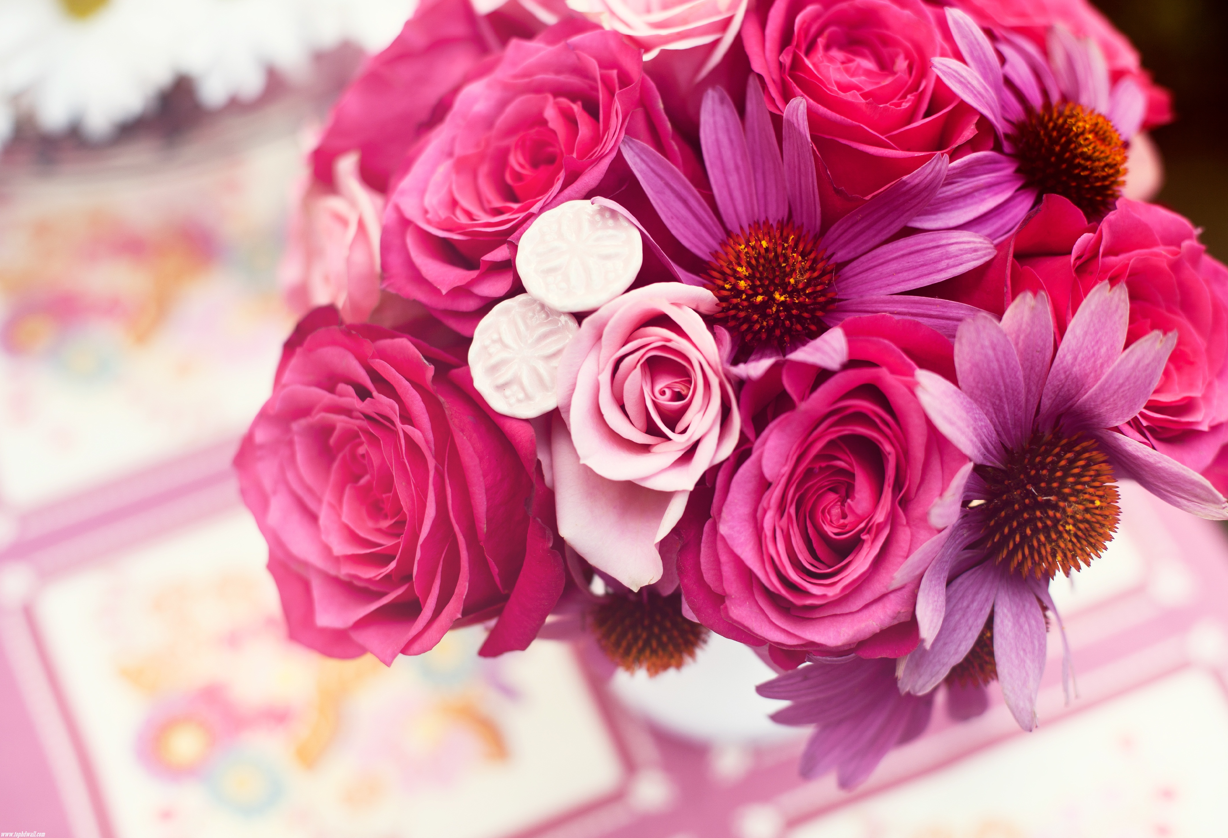 Description: A bouquet of pink and purple flowers in a vase on a table top with a pink and white table cloth.