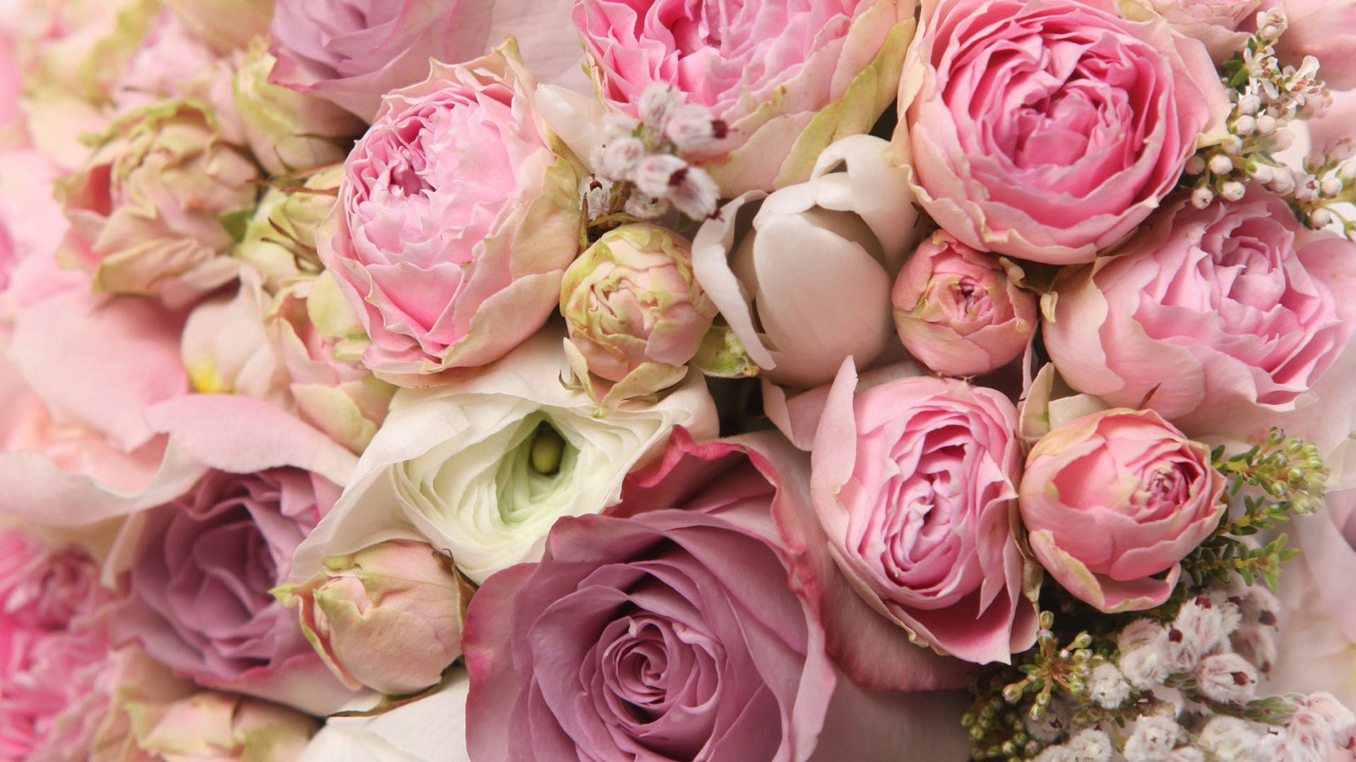 Description: A bouquet of pink and white flowers on a table top with a white background and a pink and white flower arrangement.