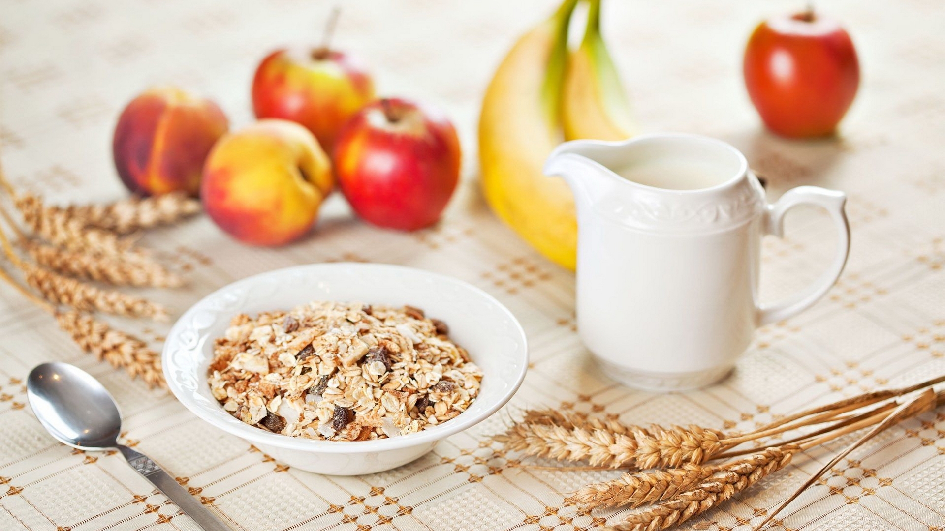 Description: A bowl of cereal next to a cup of milk and some fruit on a tablecloth with a spoon.