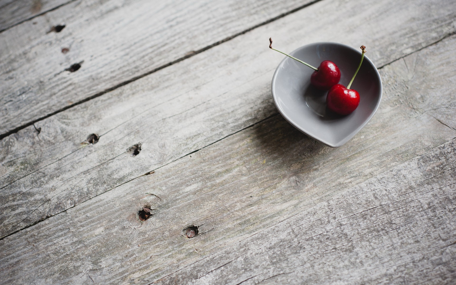 Description: A bowl of two cherries on a wooden table with ants crawling around it and a spoon in the bowl.