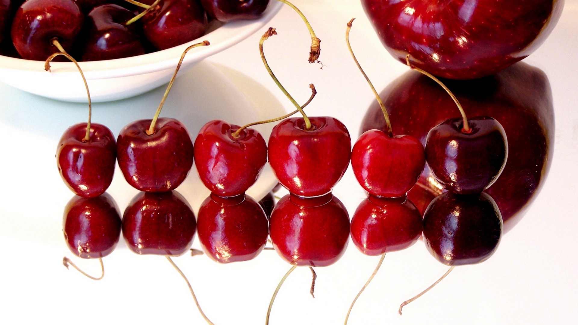 Description: A bowl of cherries and a bowl of cherries on a table with a white plate and bowl of cherries.