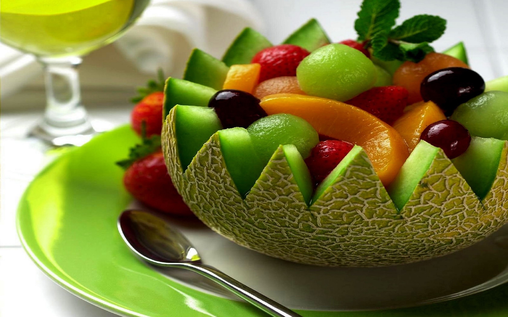 Description: A bowl of fruit with a spoon and a glass of wine in the background on a plate with a fork.