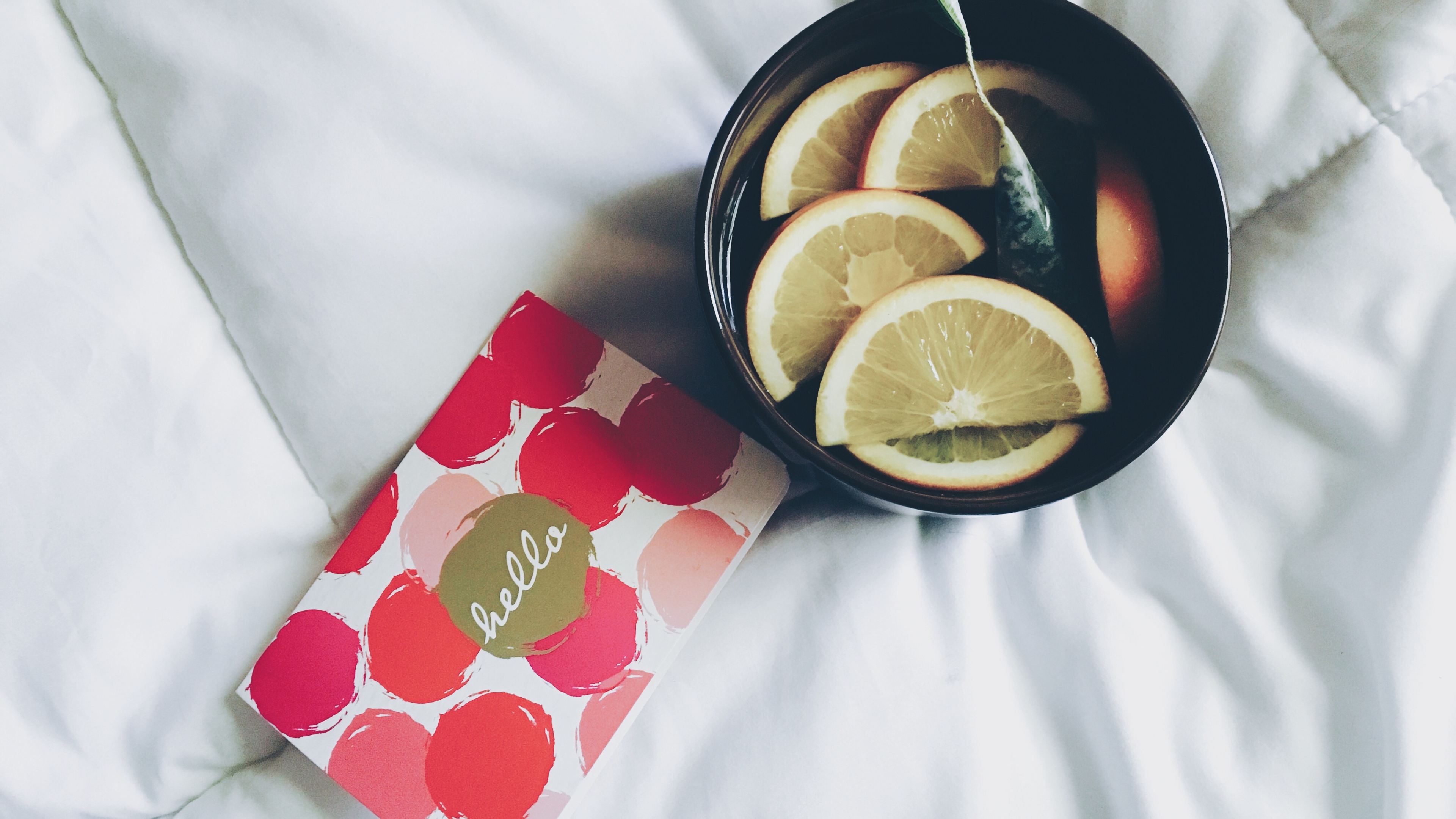 Description: A bowl of lemons and a notepad on a bed with a white sheet and a white blanket.