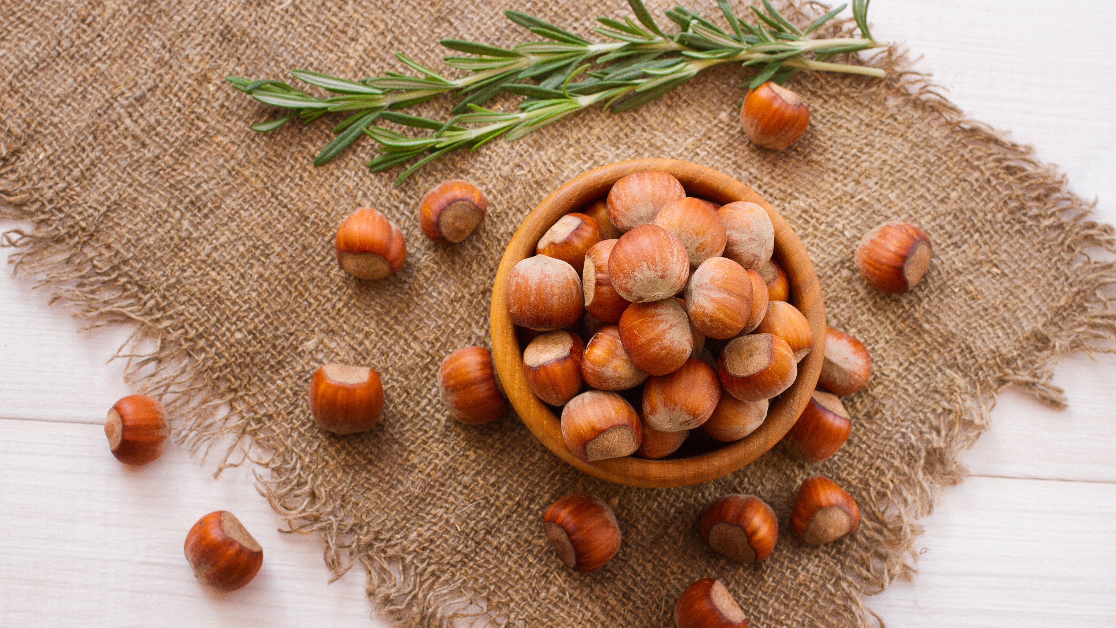Description: A bowl of nuts and a sprig of rosemary on a burlap cloth on a white wooden table.