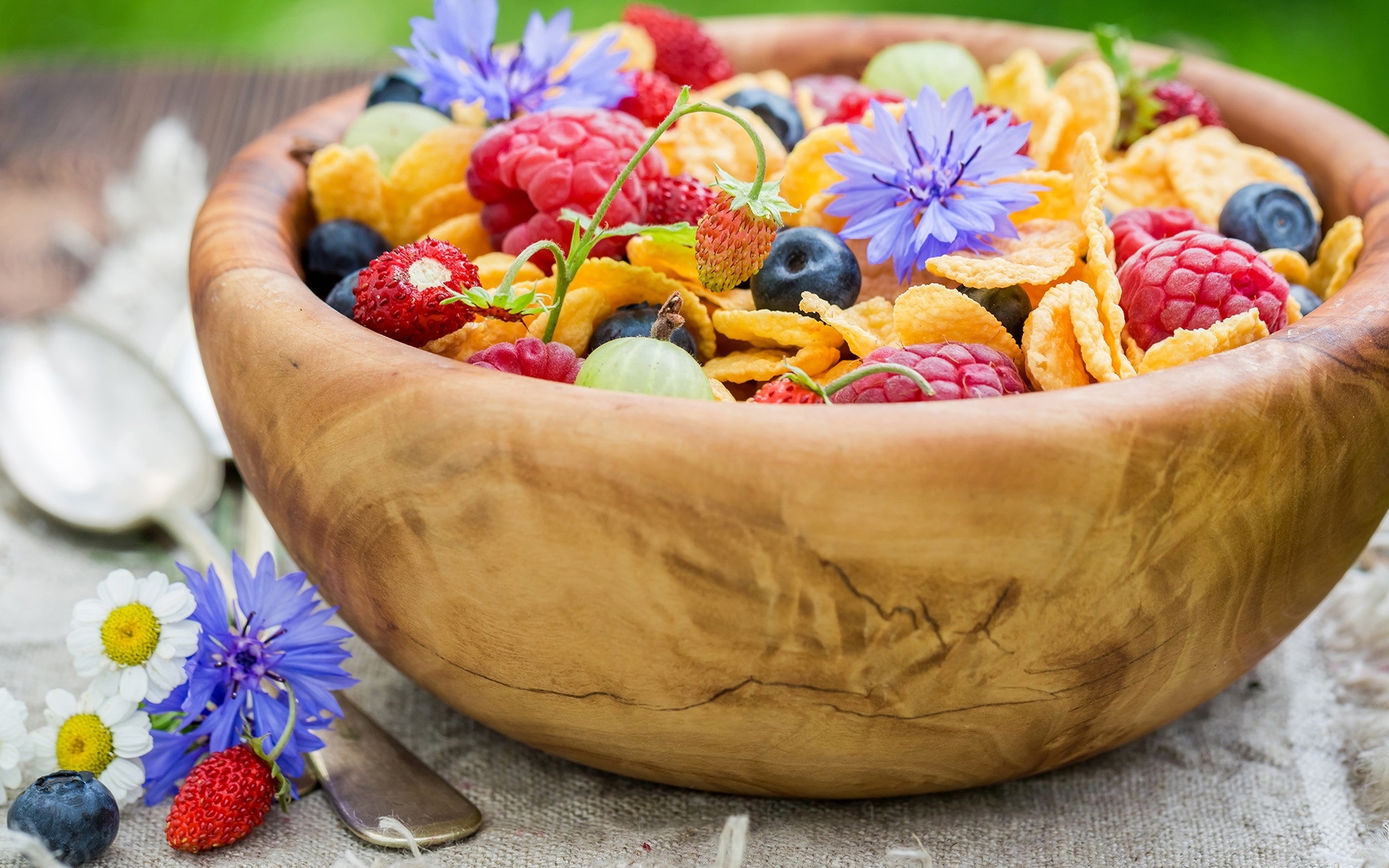 Description: A bowl of fruit and flowers on a table with a spoon and spoon rest nearby on a table cloth.