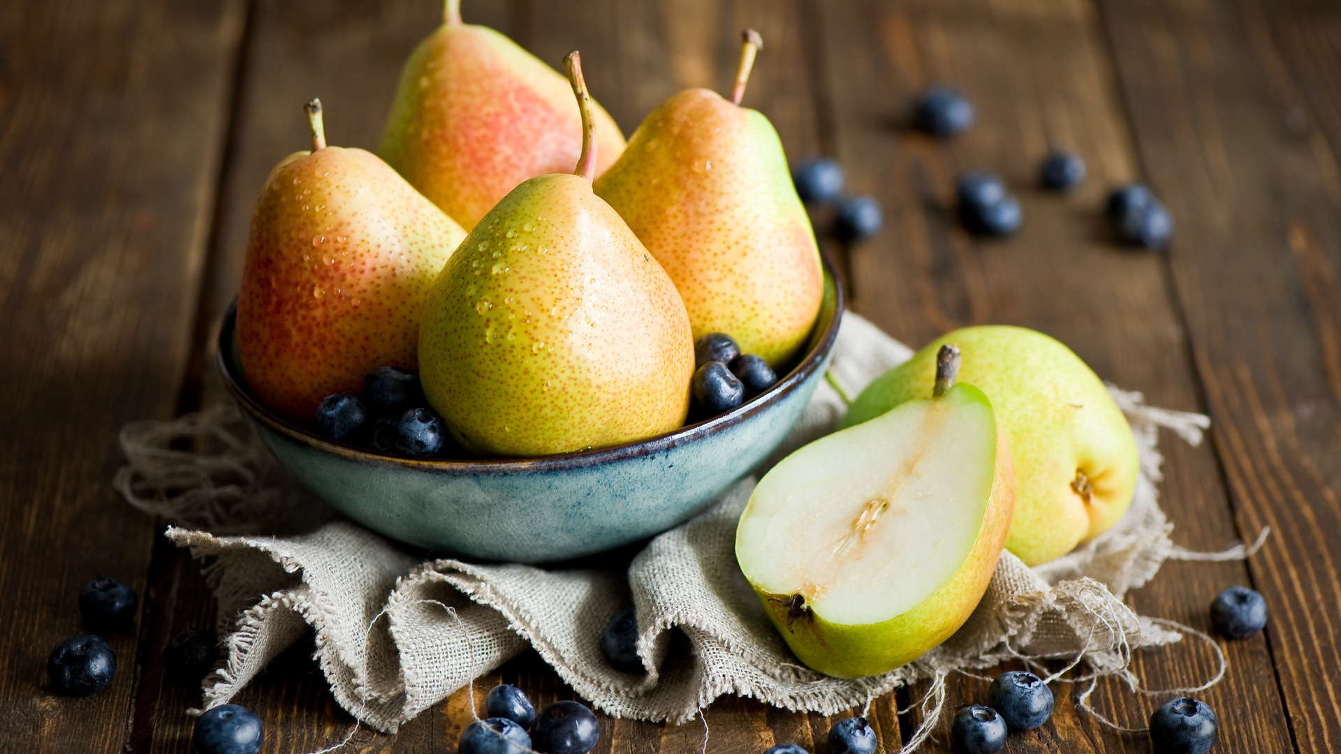 Description: A bowl of fruit with blueberries and pears on a table with a cloth on it and a cloth.