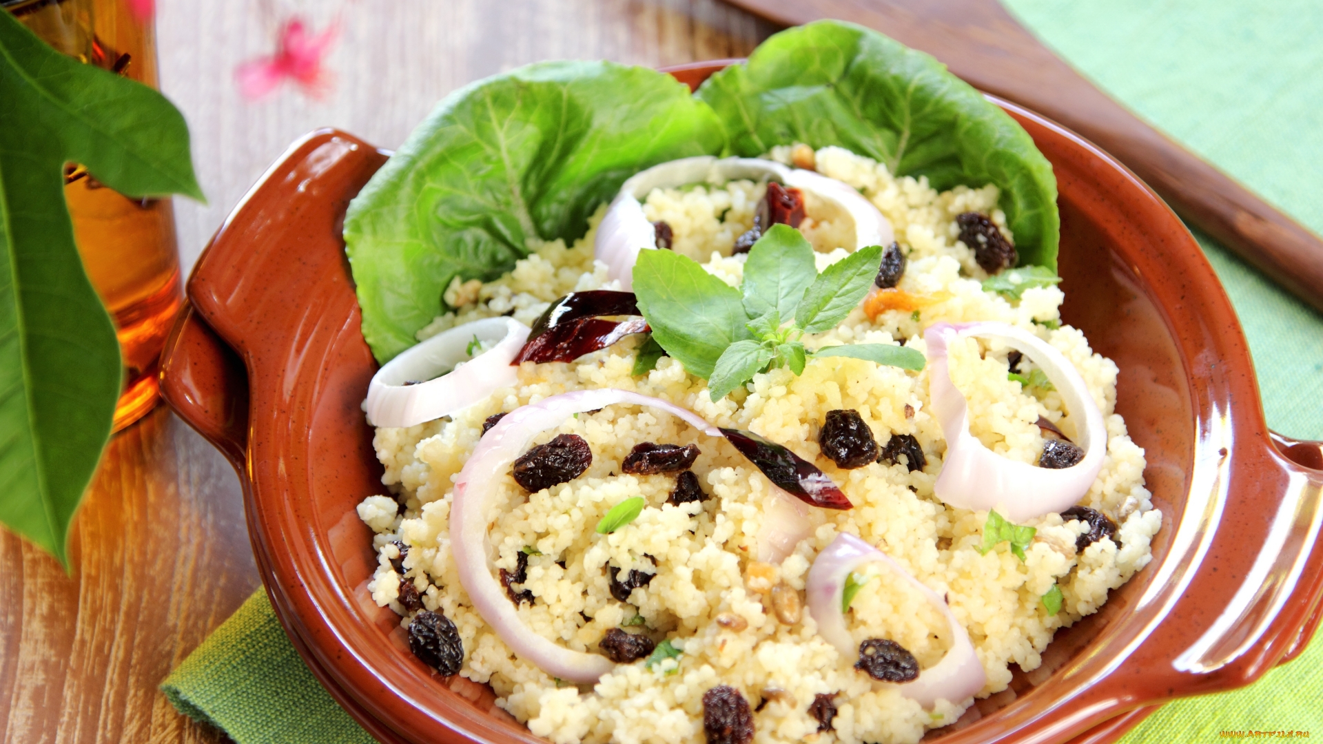 Description: A bowl of food with onions and herbs on a table with a spoon and a bottle of wine in the background.