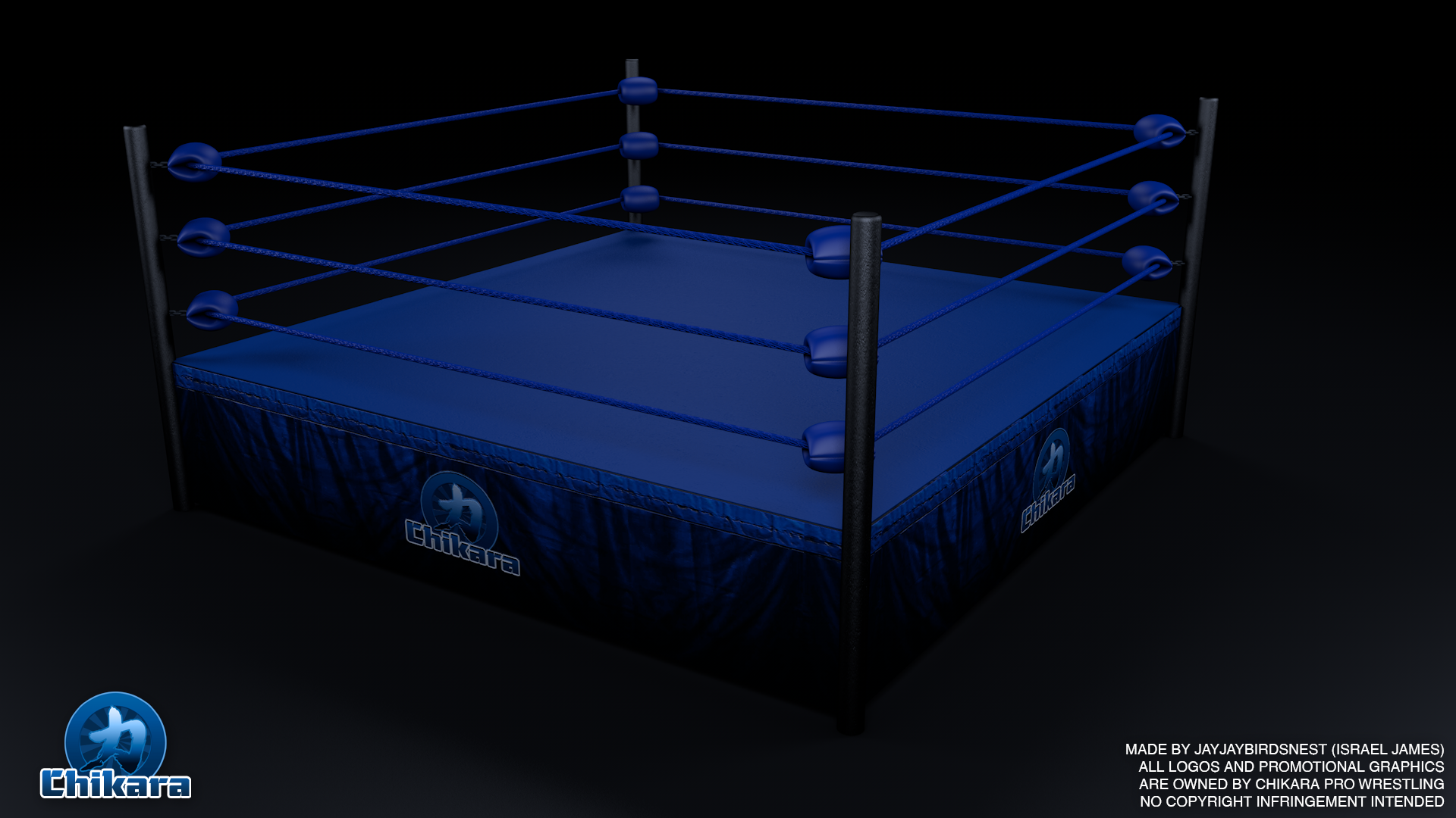 Description: A 3d model of a boxing ring with a blue ring and ropes on it.