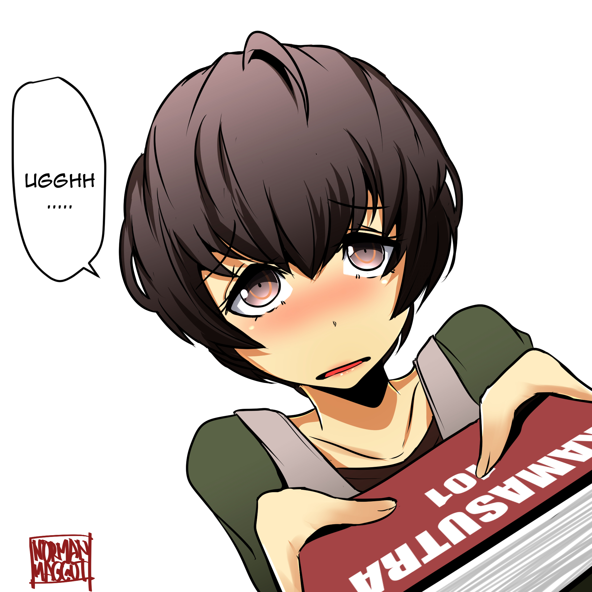 Description: A boy with a book in his hand and a thought bubble above him that says.