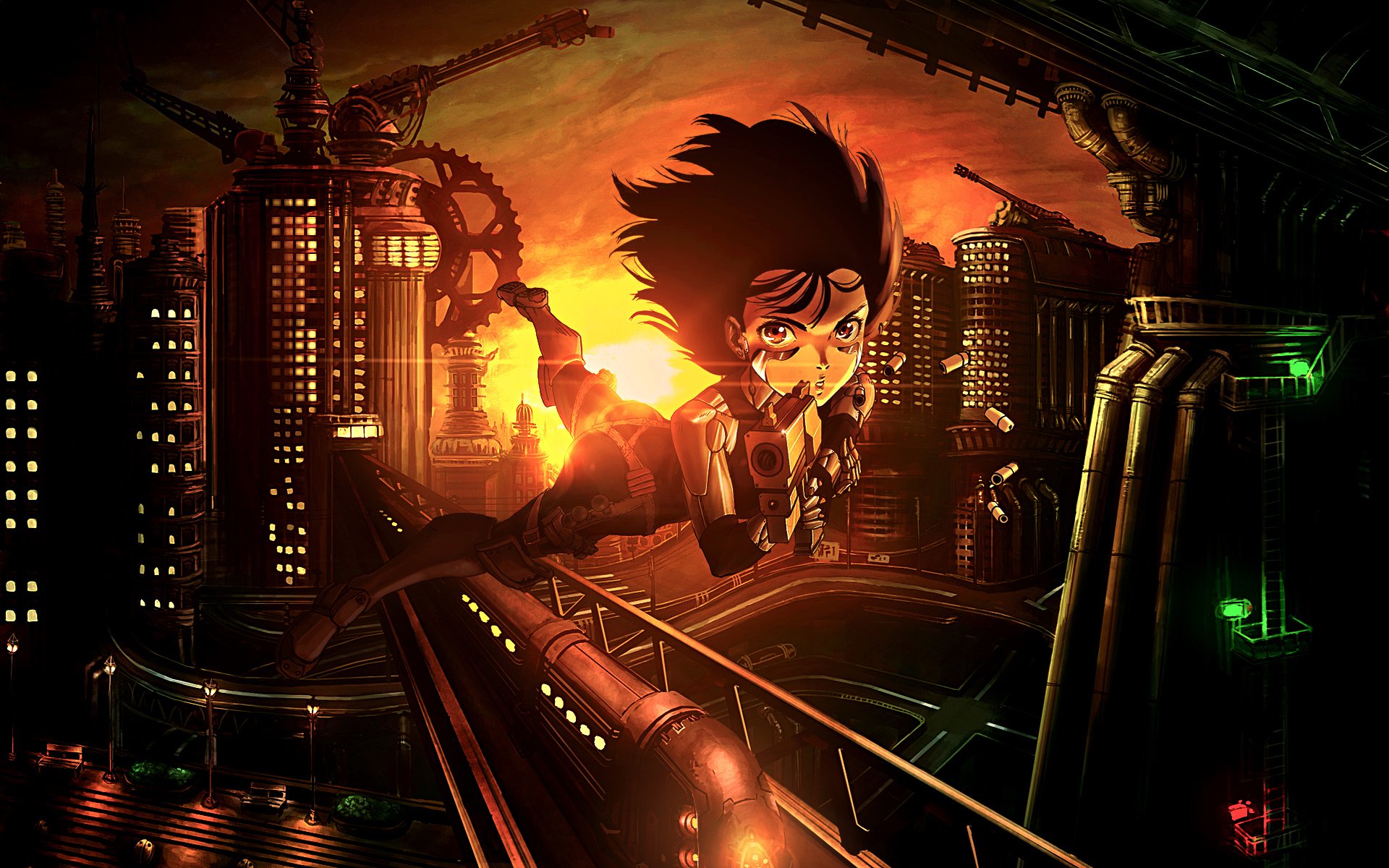 Description: A boy is standing on a train track in a city at night with a city skyline in the background.