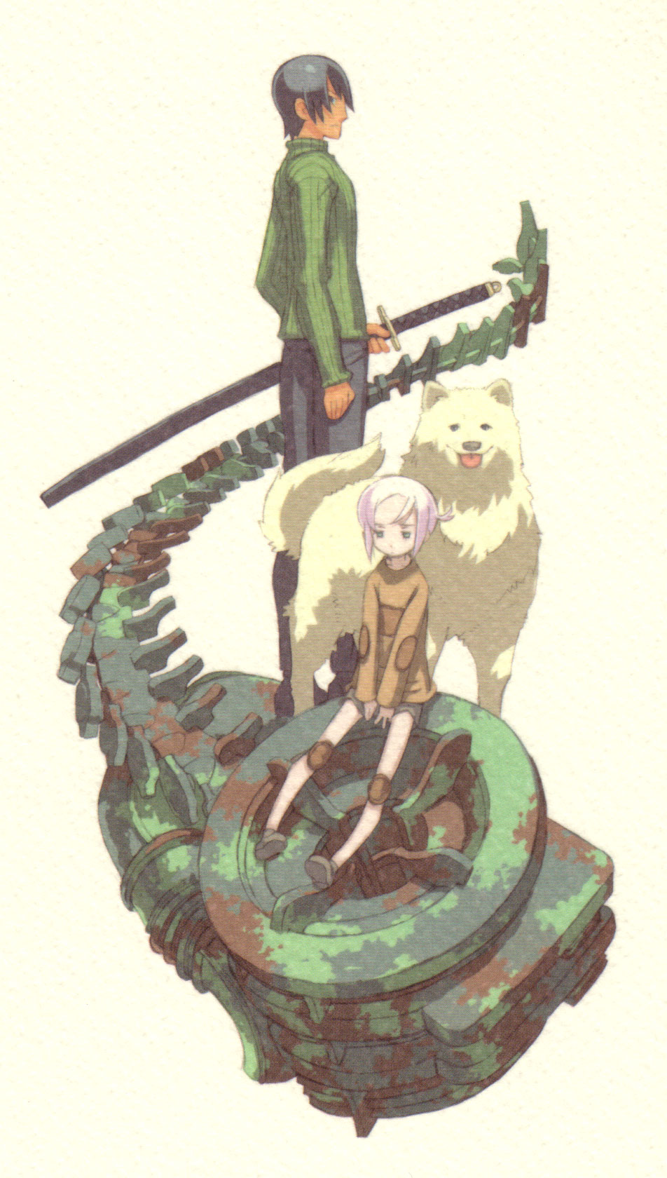 Description: A drawing of a boy and a dog on a train track with a man standing on top of it.