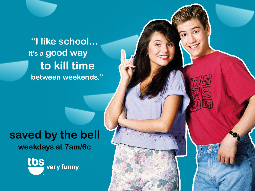 Description: A boy and a girl are posing for a picture together with a blue background and a quote from the movie saved by the bell.