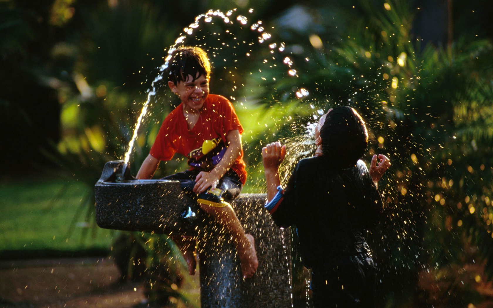 Description: A boy and a girl playing in a fountain of water with each other in the park.