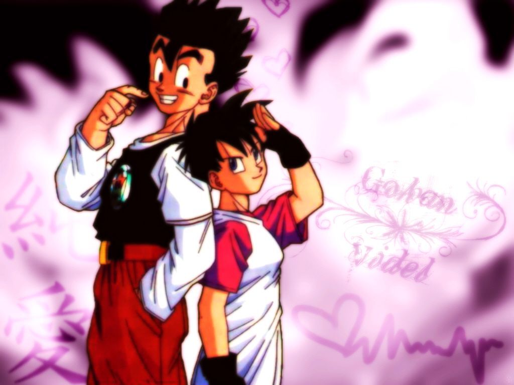 Description: A boy and a girl are standing together in front of a purple background with words and symbols on it.