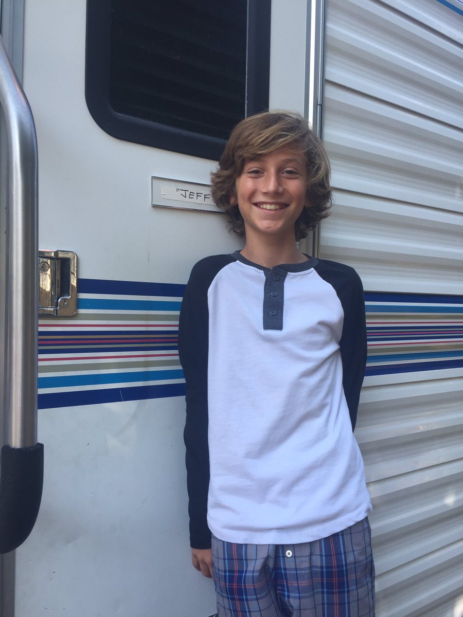 Description: A boy standing in front of a trailer smiling for the camera with his eyes closed and his hair in a bun.
