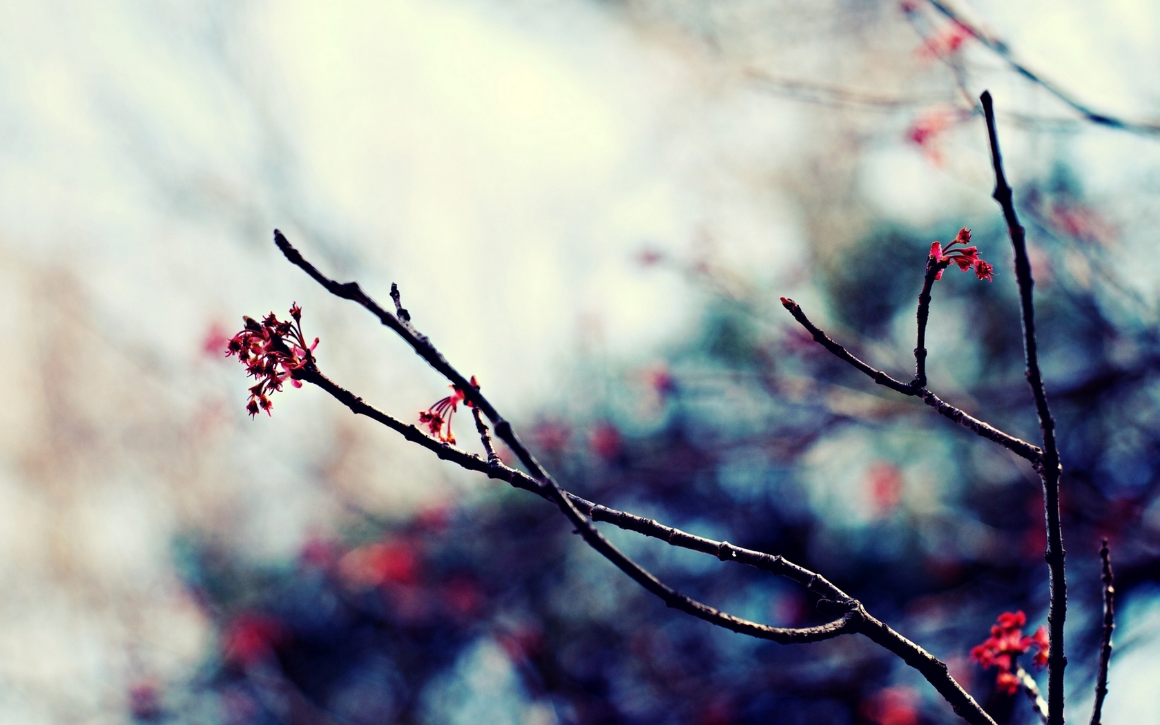 Description: A branch with red flowers on it and a sky background with clouds in the background.