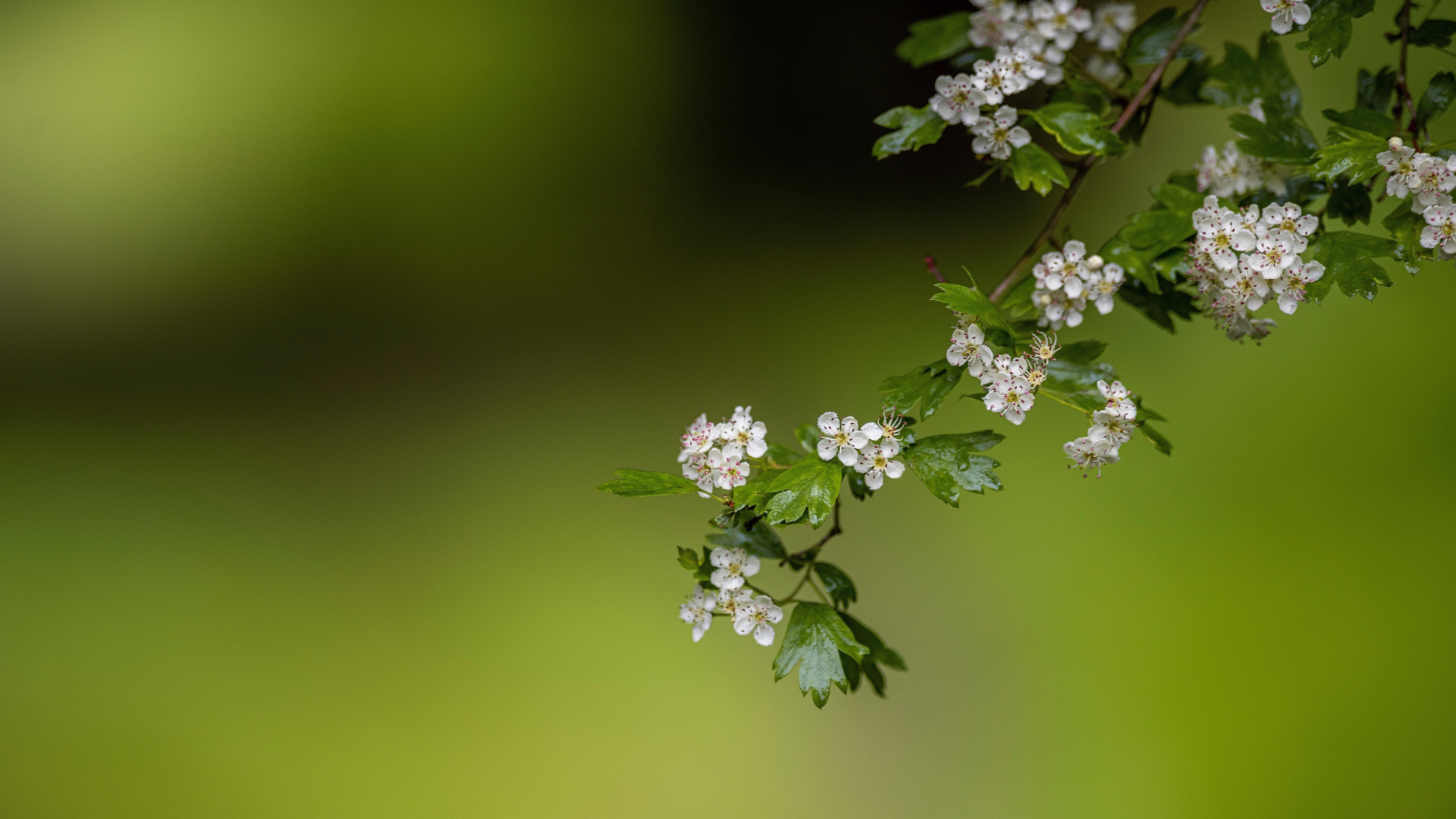 Description: A branch with white flowers and green leaves on it.