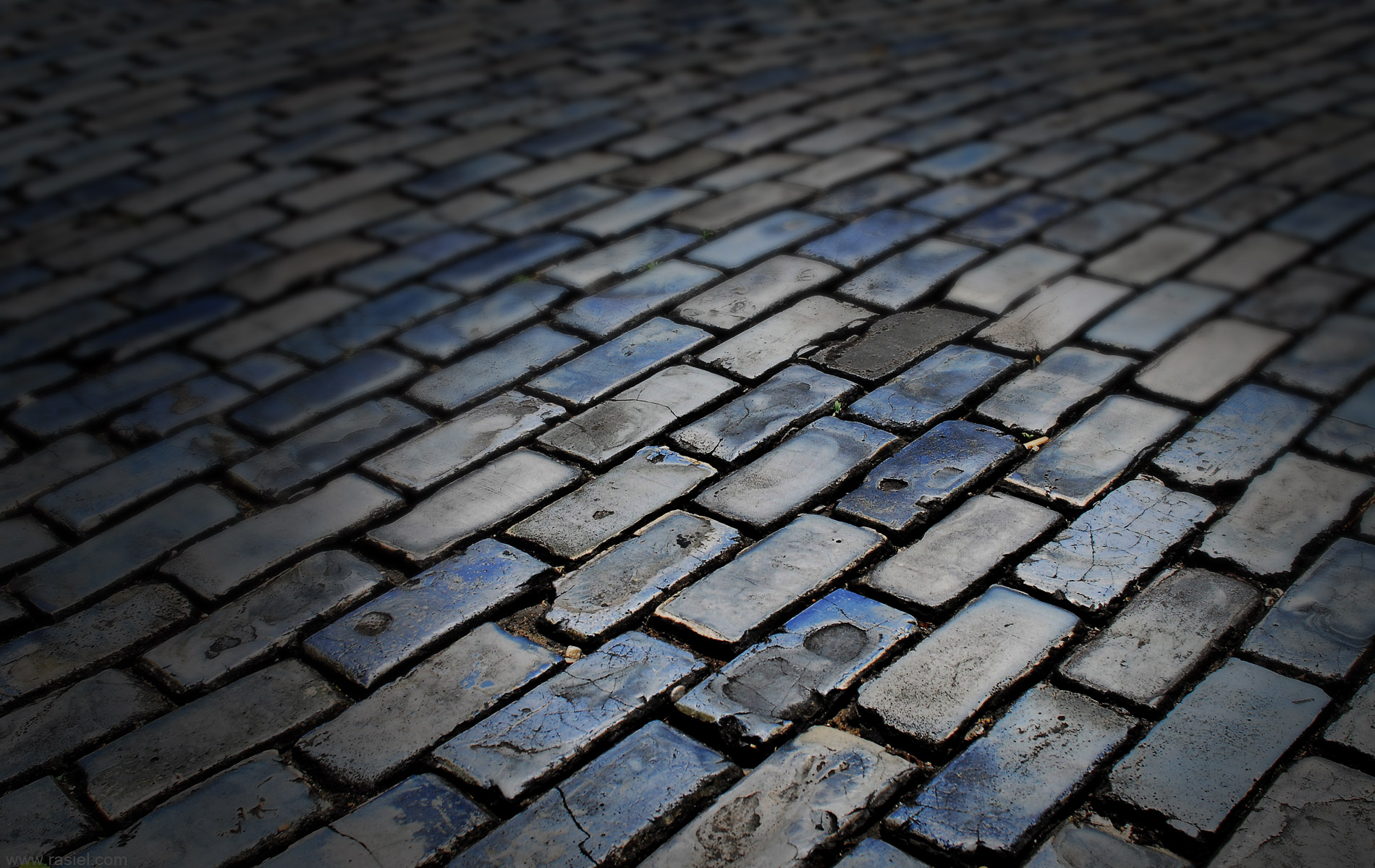 Description: A close up of a brick road with a blue sky in the background and a small patch of grass in the middle.