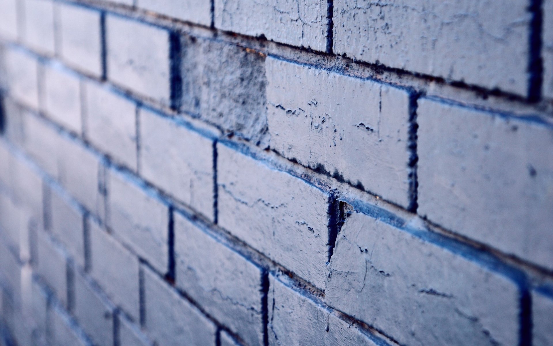 Description: A close up of a brick wall with blue paint on it's sides and a white background with a black line.