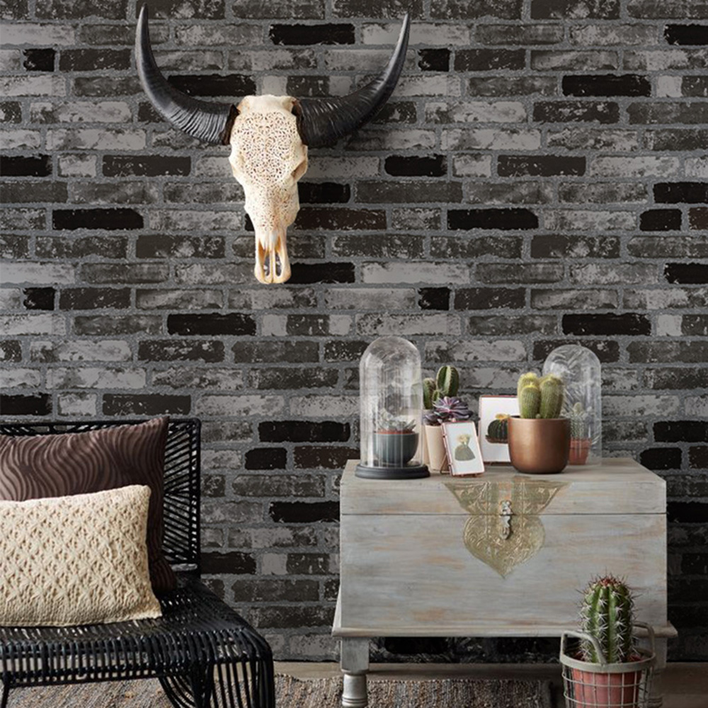 Description: A room with a brick wall and a cow skull on the wall and a chair and a table with a cactus in it.