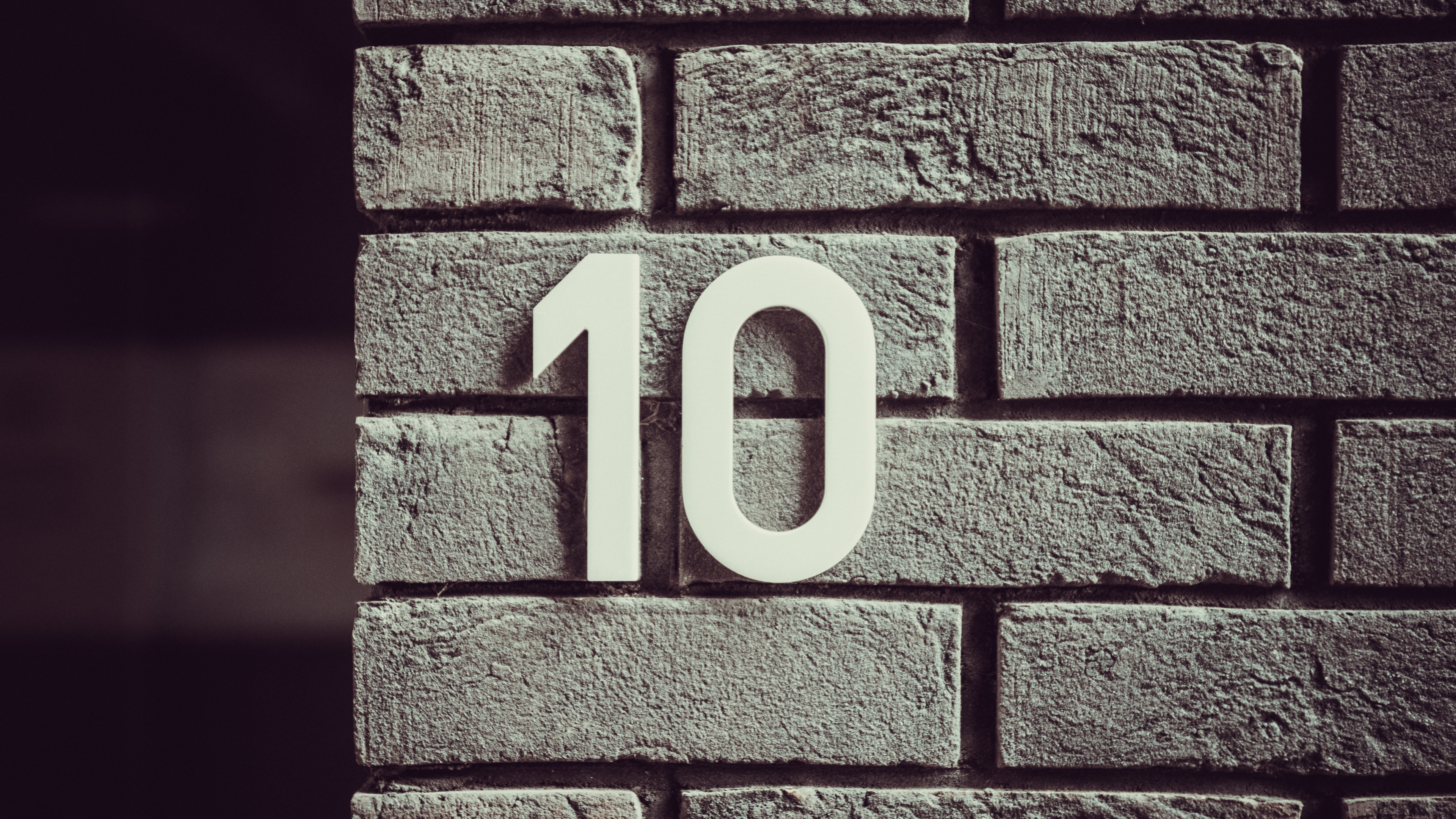 Description: A brick wall with a white number ten on it's side and a brick wall behind it with a black and white photo of the number ten.
