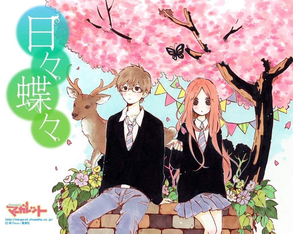 Description: A couple of people sitting on a brick wall under a tree with flowers and butterflies flying above them and a pink tree with pink flowers.