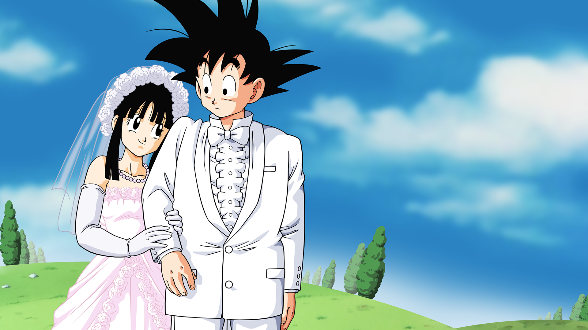 Description: A cartoon of a bride and a groom standing together in a field with a blue sky in the background.