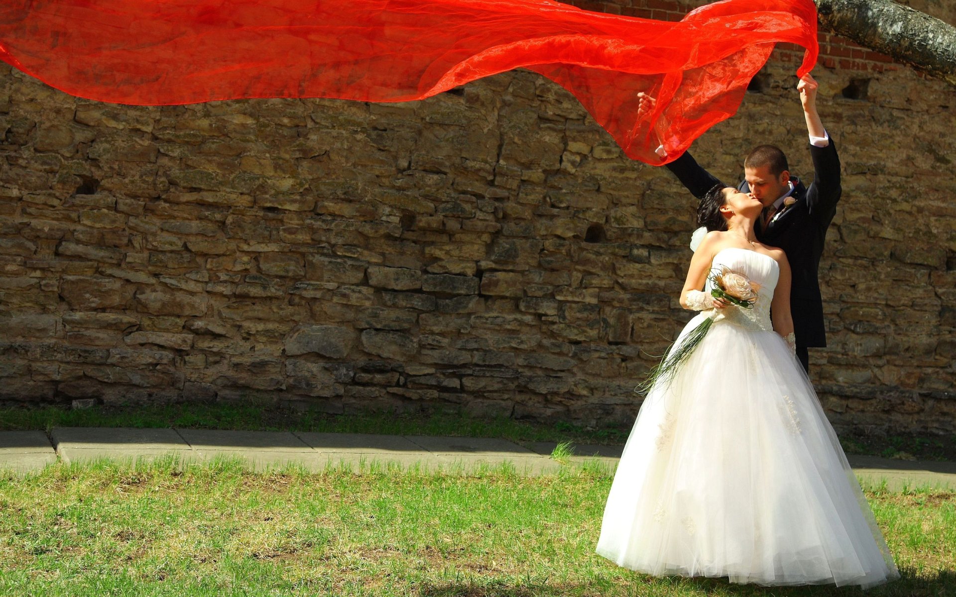 Description: A bride and groom holding a red scarf in front of a stone wall and a tree branch with a red cloth flying in the wind.