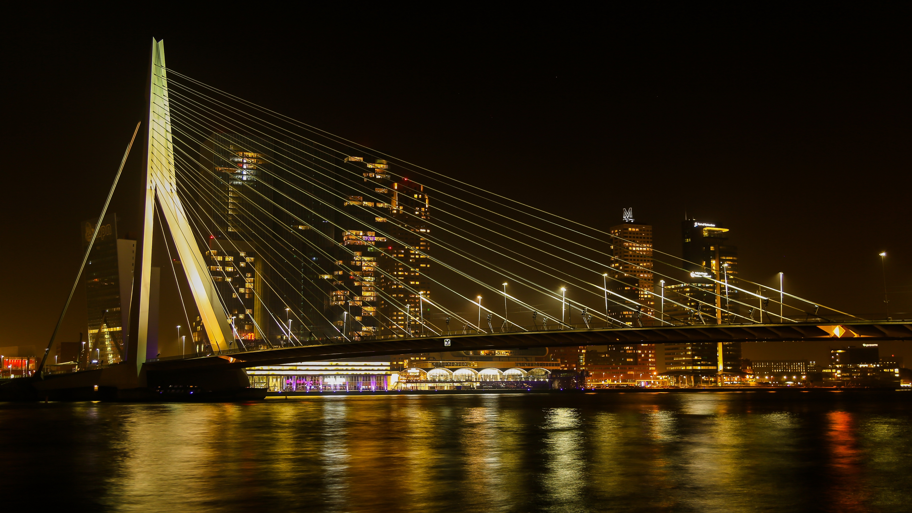 Description: A bridge that is over a body of water at night time with lights on it and a city in the background.