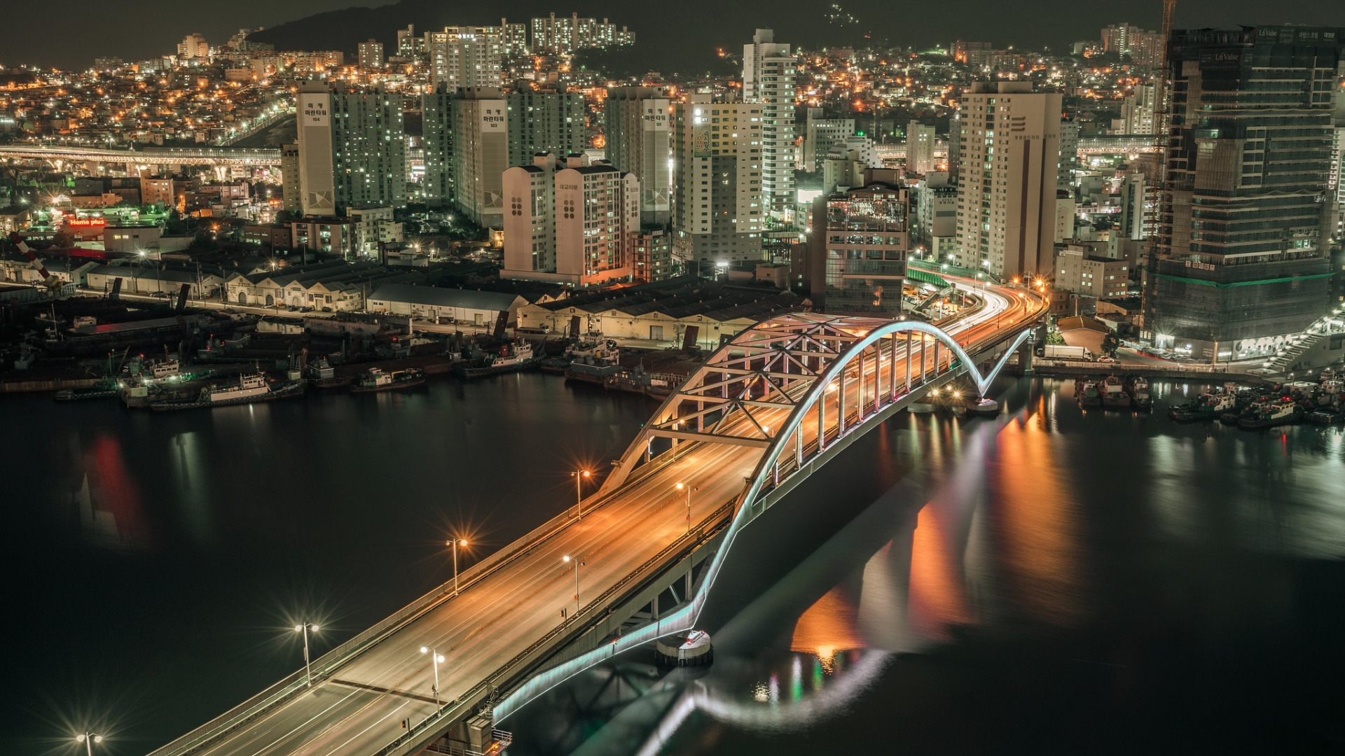 Description: A bridge over a river with a city in the background at night time with lights on it and a bridge going over the water.