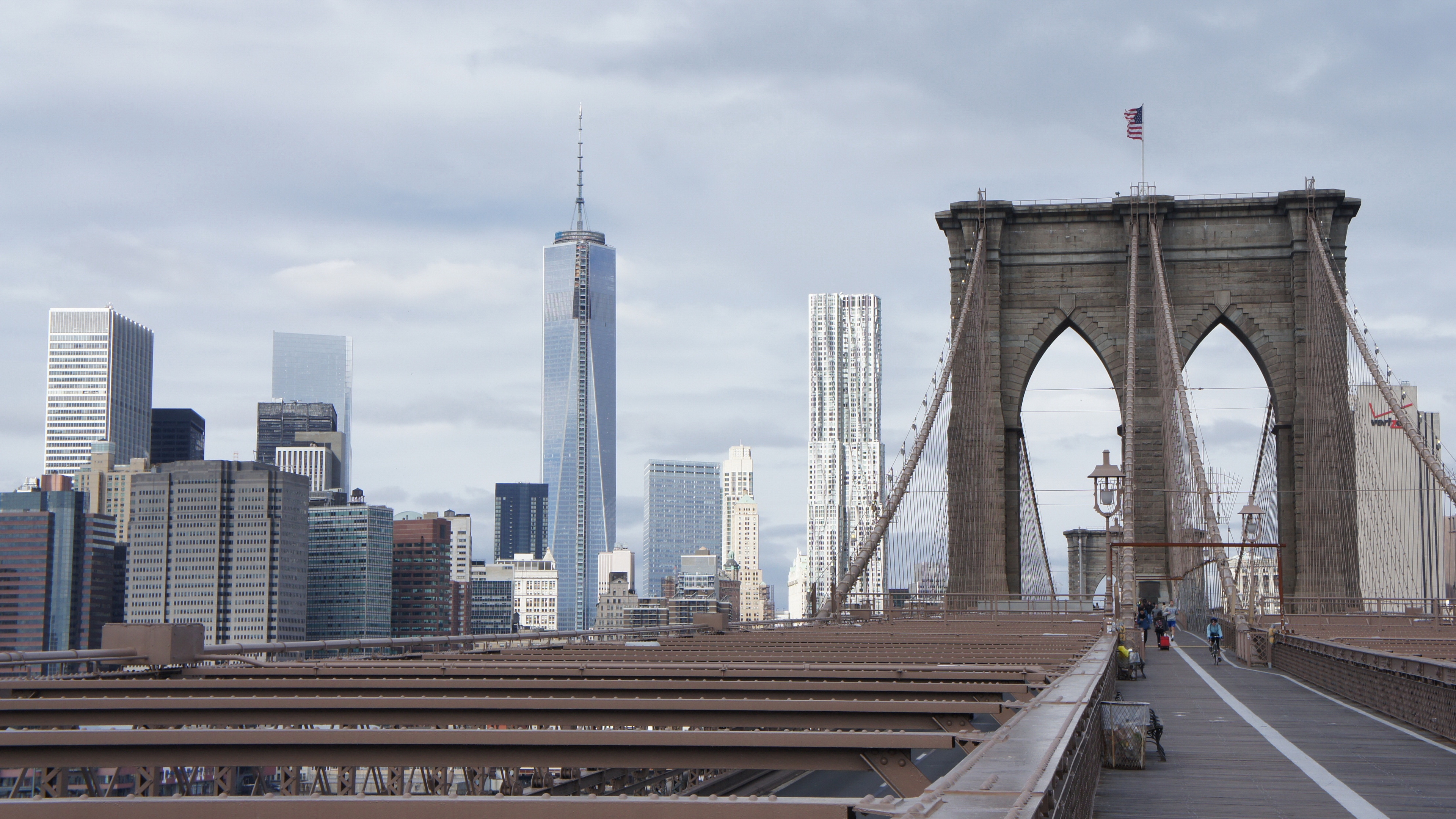 Description: A bridge with a view of a city in the background and people walking on the bridge and on the sidewalk.