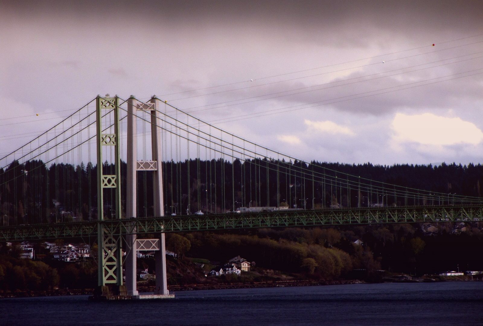 Description: A bridge with a clock on it and a cloudy sky above it and a town in the background with trees.