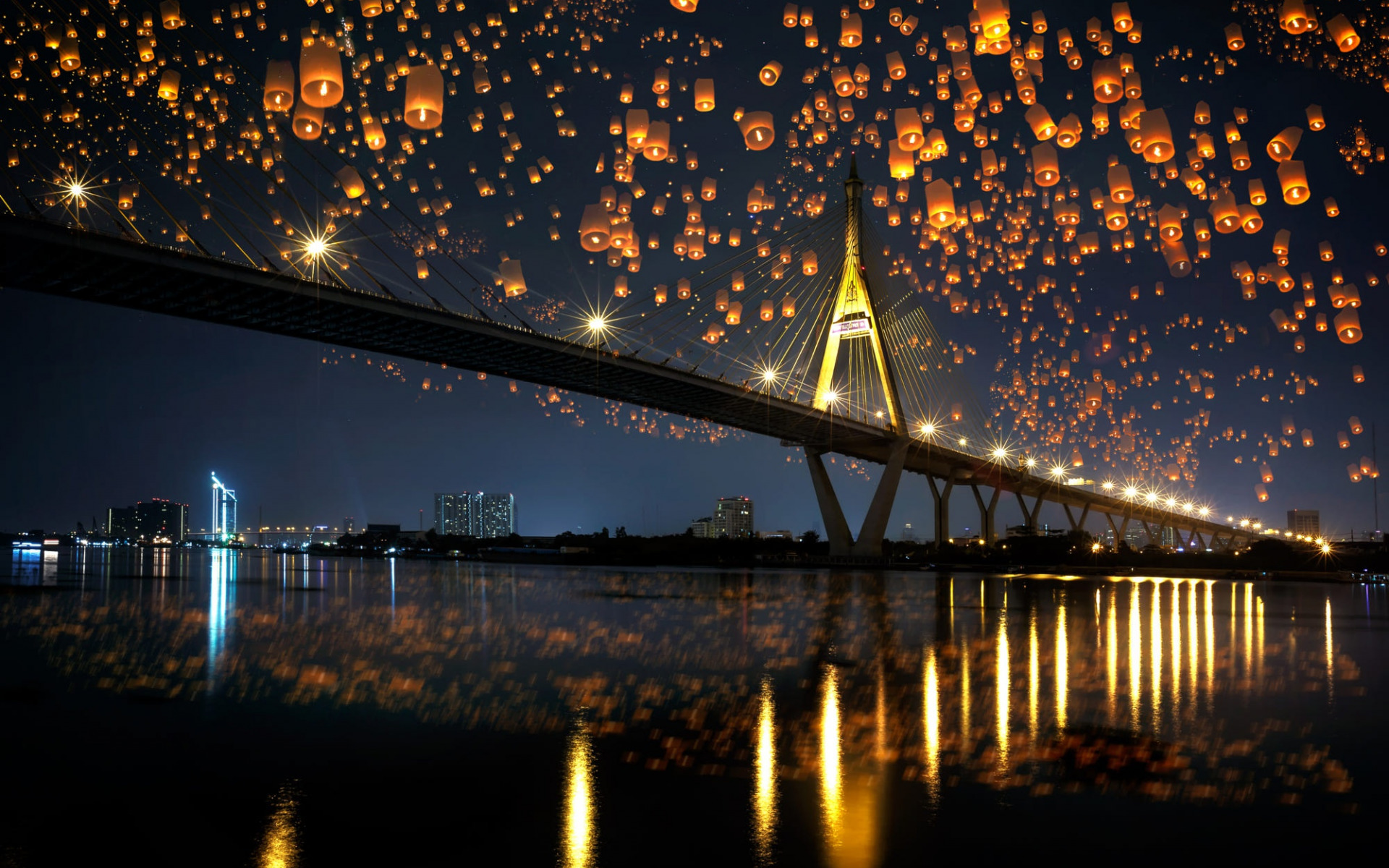 Description: A bridge with many lanterns floating in the air above it at night time with a city skyline in the background.