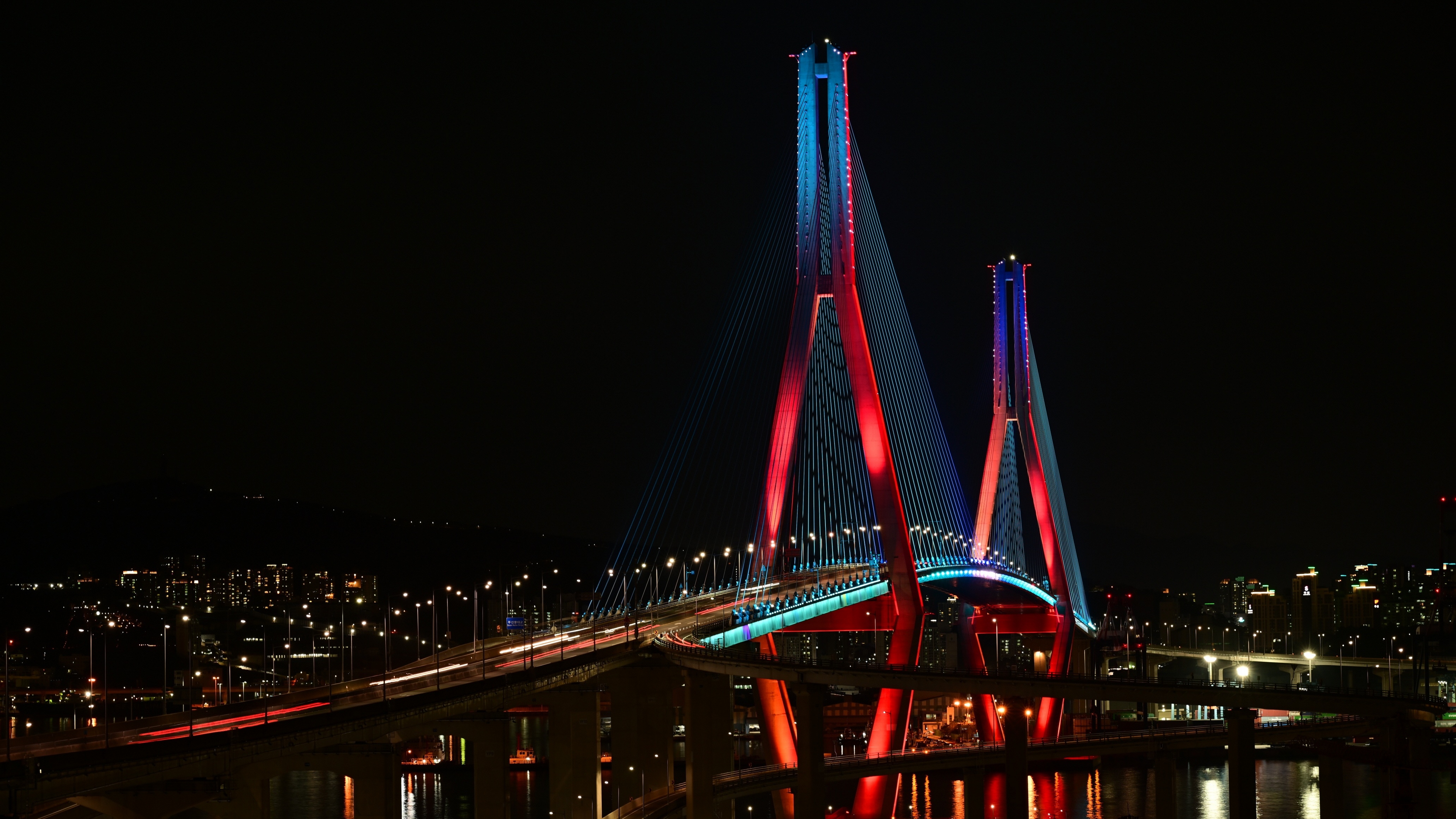 Description: A bridge with a red and blue light on it at night time with city lights in the background and a bridge with a red and blue light on it.