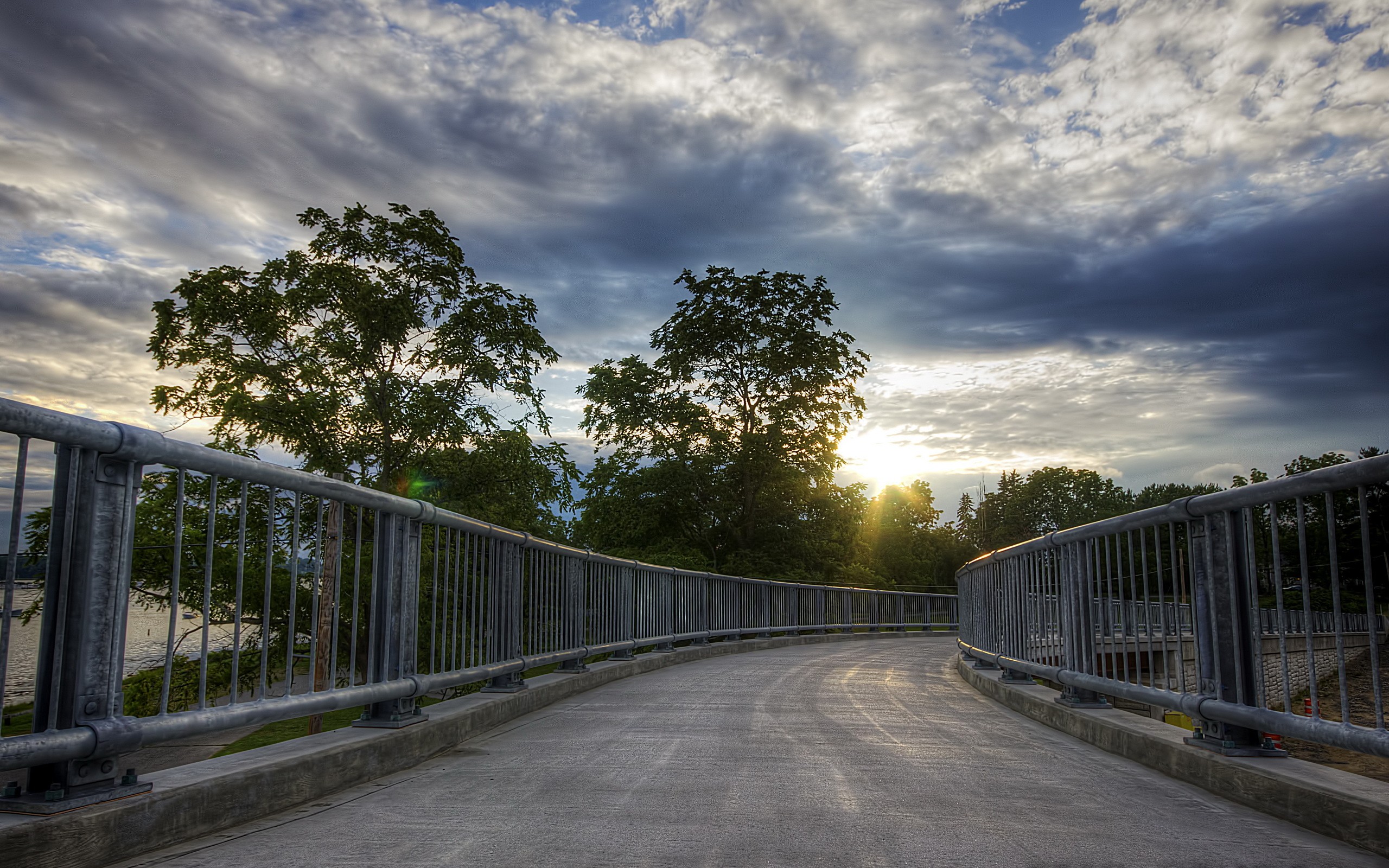 Description: A bridge with a metal railing and a tree in the background with a cloudy sky above it and a sun setting behind the bridge.