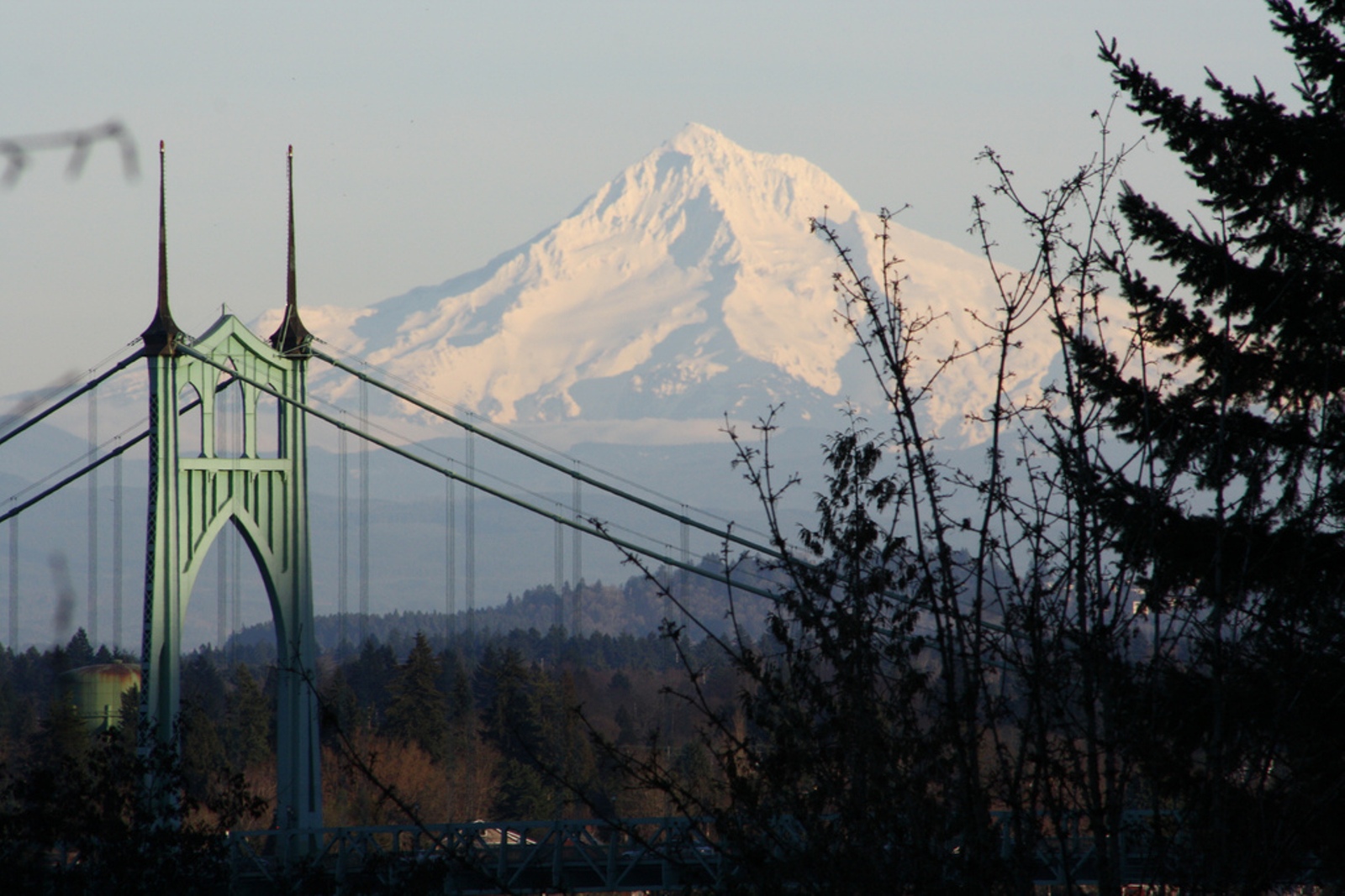 Description: A bridge with a mountain in the background and trees in the foreground with a view of a snow capped mountain.