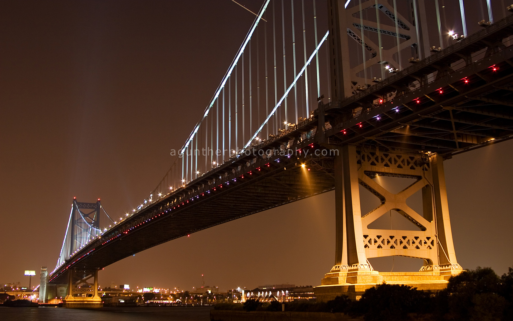 Description: A bridge that is going over a body of water at night time with lights on it and a city in the background.