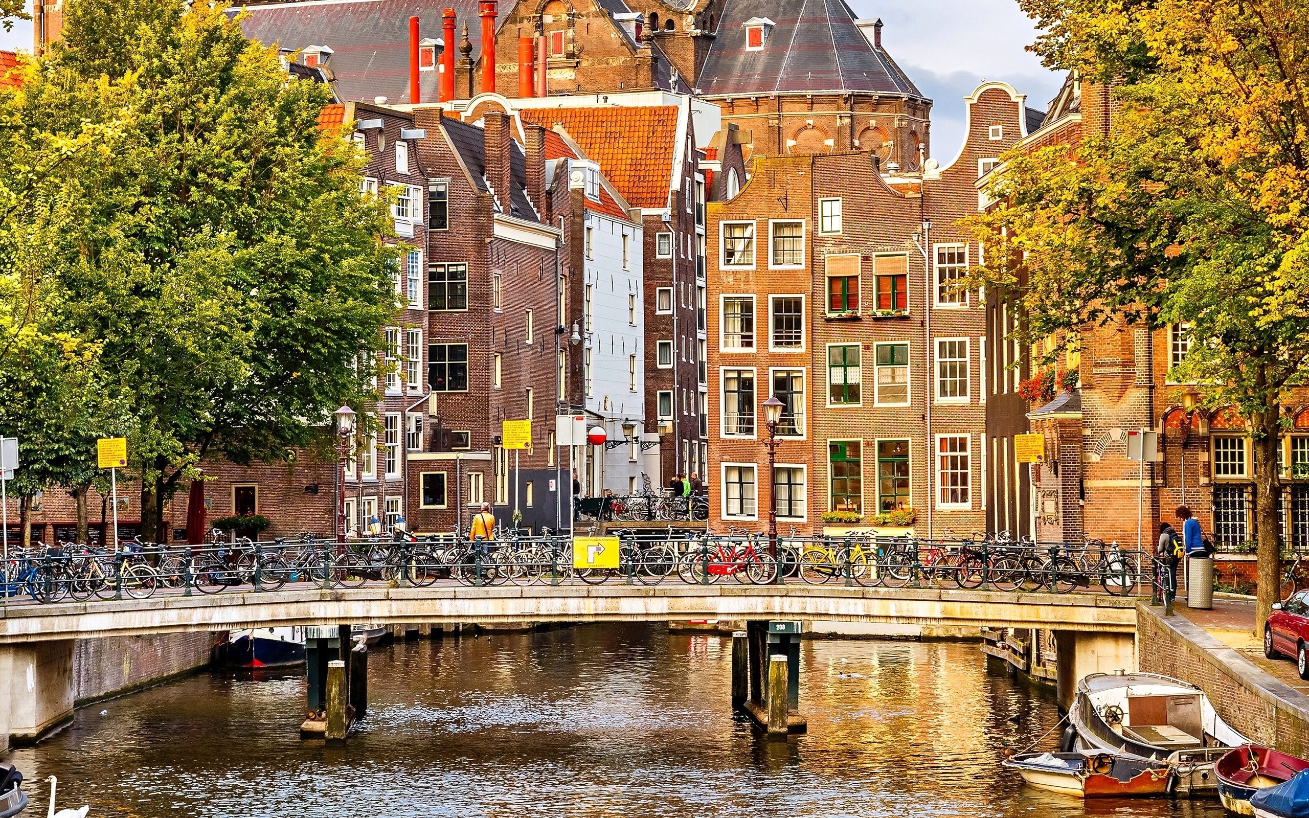 Description: A bridge over a river with bicycles on it and buildings in the background with people walking on the bridge.