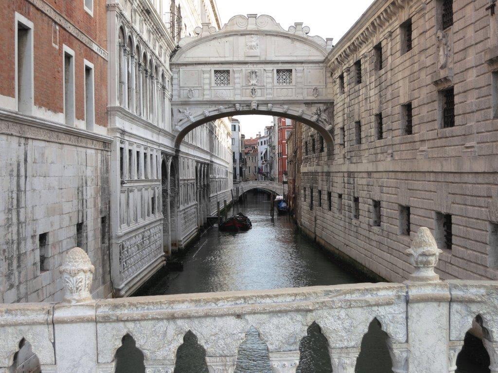 Description: A bridge over a river with a boat going under it and a building with a bridge on the other side.