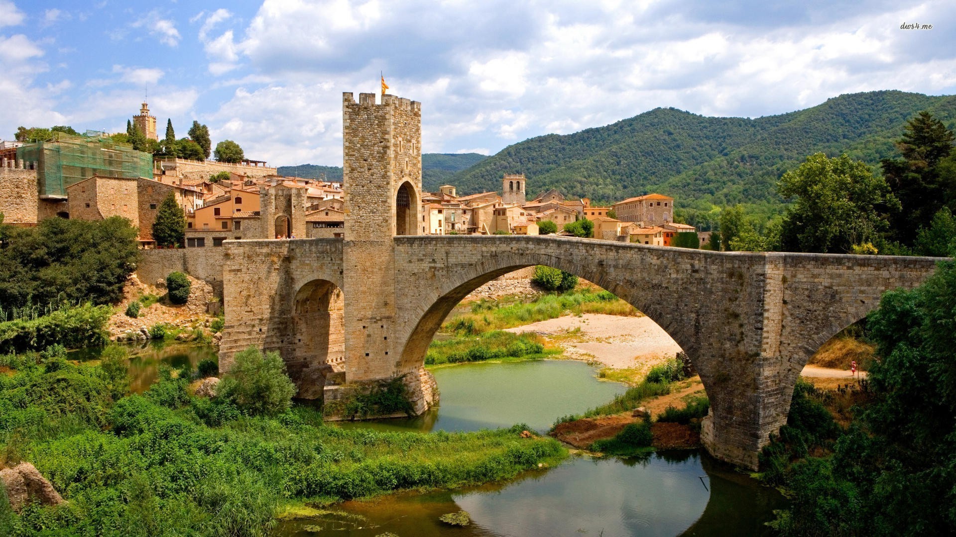 Description: A bridge over a river with a castle in the background and a town in the distance with mountains in the background.