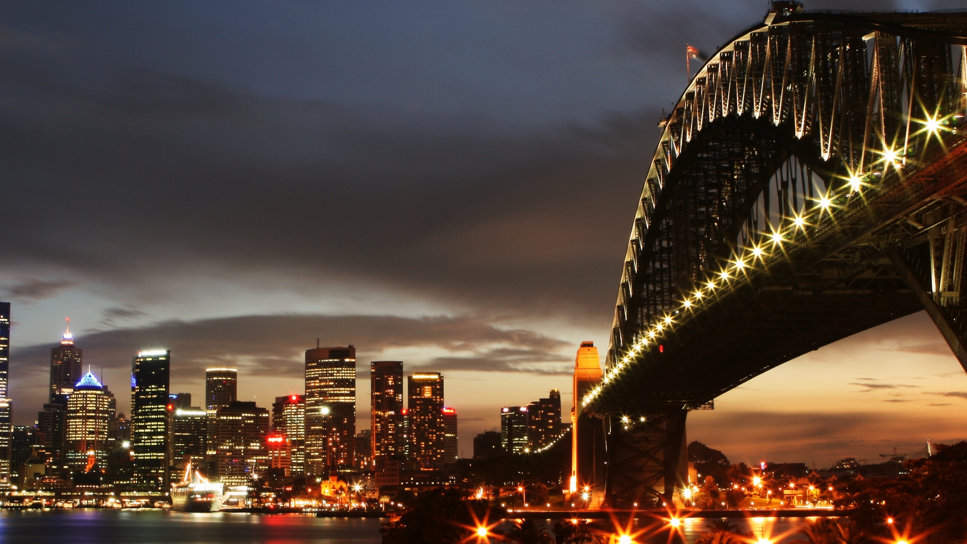 Description: A bridge over a river with a city in the background at night time with lights on it and a city skyline.