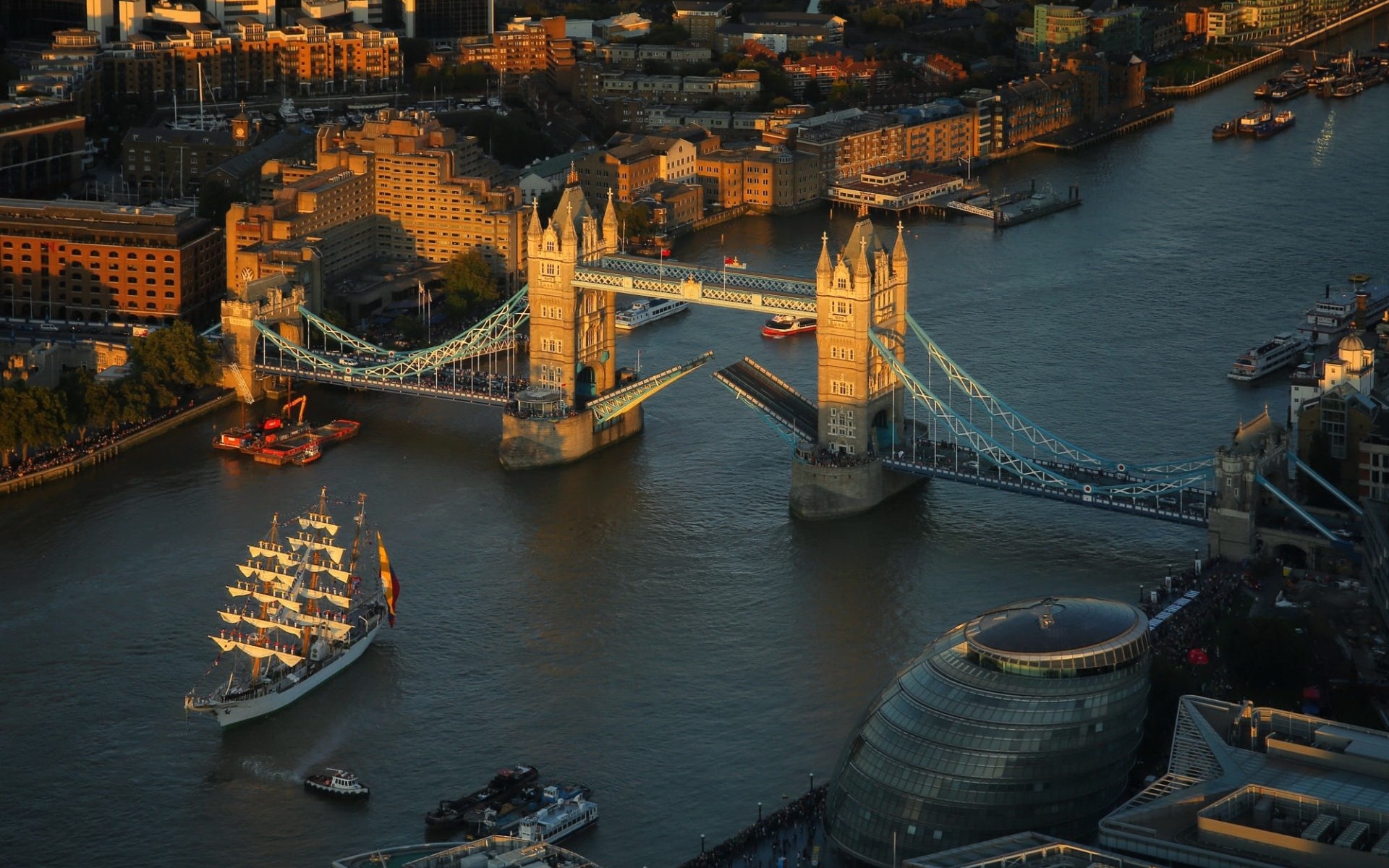 Description: A bridge spanning over a river with a boat in the water below it and a city in the background.
