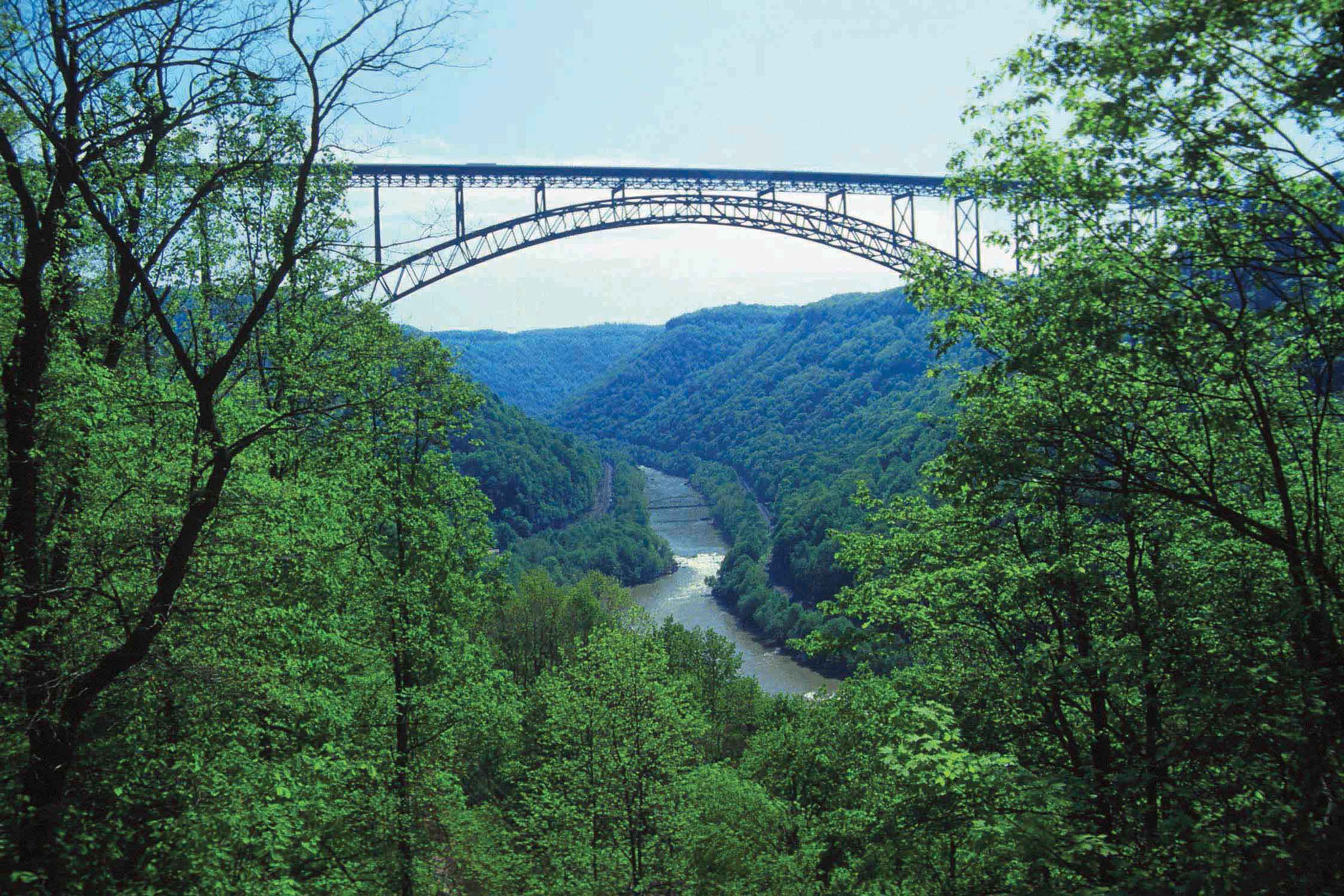 Description: A bridge over a river in a forest with a bridge in the background and a river below it in the foreground.