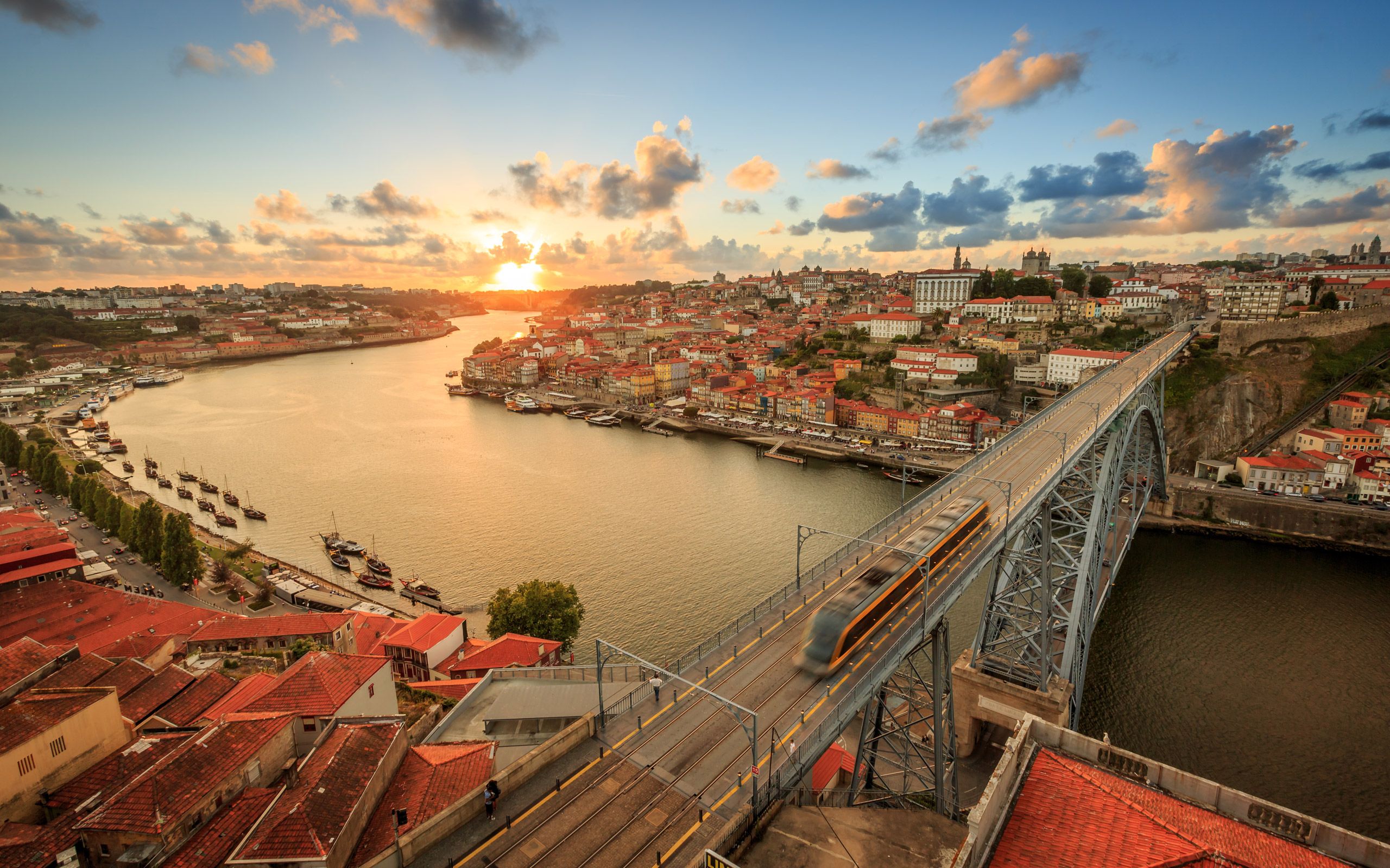 Description: A bridge over a river with a train on it and a city in the background at sunset or sunrise.